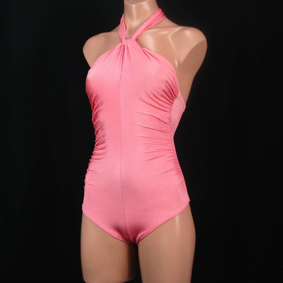 E7679★ビーチドリーム ピンク 水着 かわいい リボン ホルターネック ワンピース レディースM レトロ おしゃれ 水泳 プール ビーチ 海