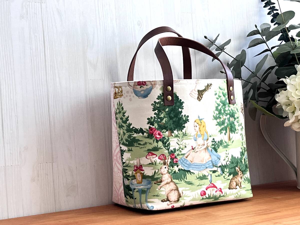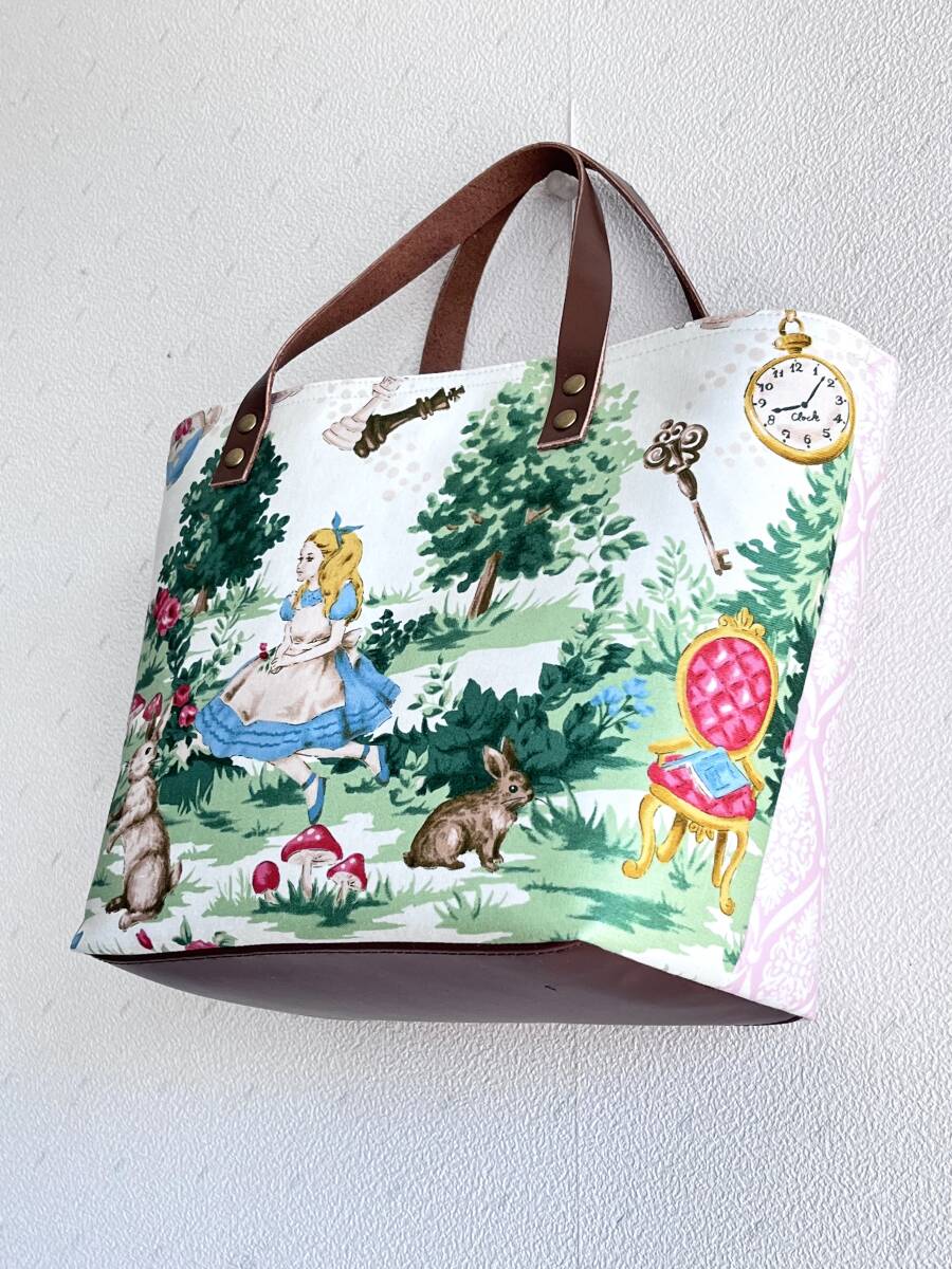 ハンドメイド+迷い込んだ不思議の国のアリス+②+うさぎ+きのこ +ピンク+ バラ+ Mサイズ+ころりん+トートバッグ +本革