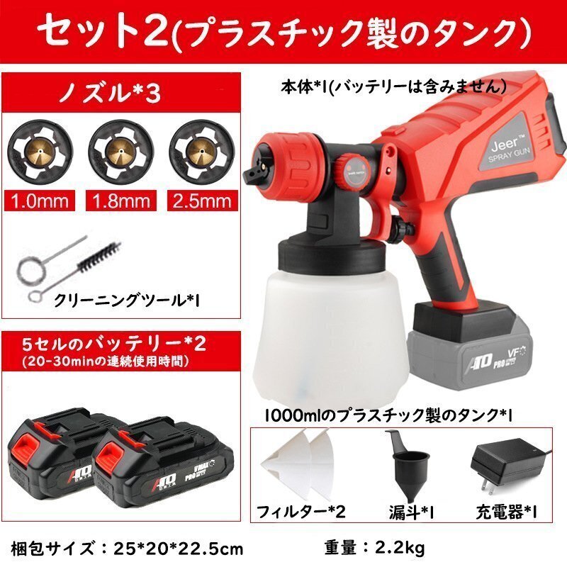 Product name: 電動スプレーガン 吸上式 吹き付け式 塗装機 大容量1000ml 油性水性噴霧 5セリのバッテリー*2+充電器*1+プラスチック製タンク+ノズル*3
