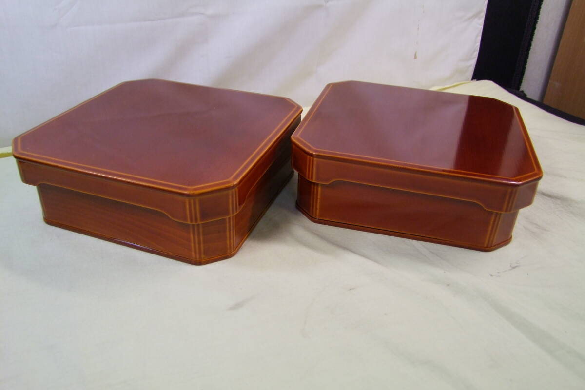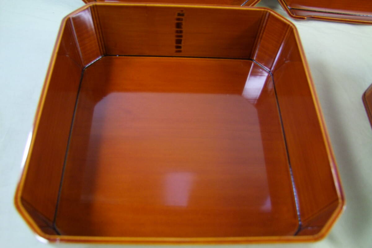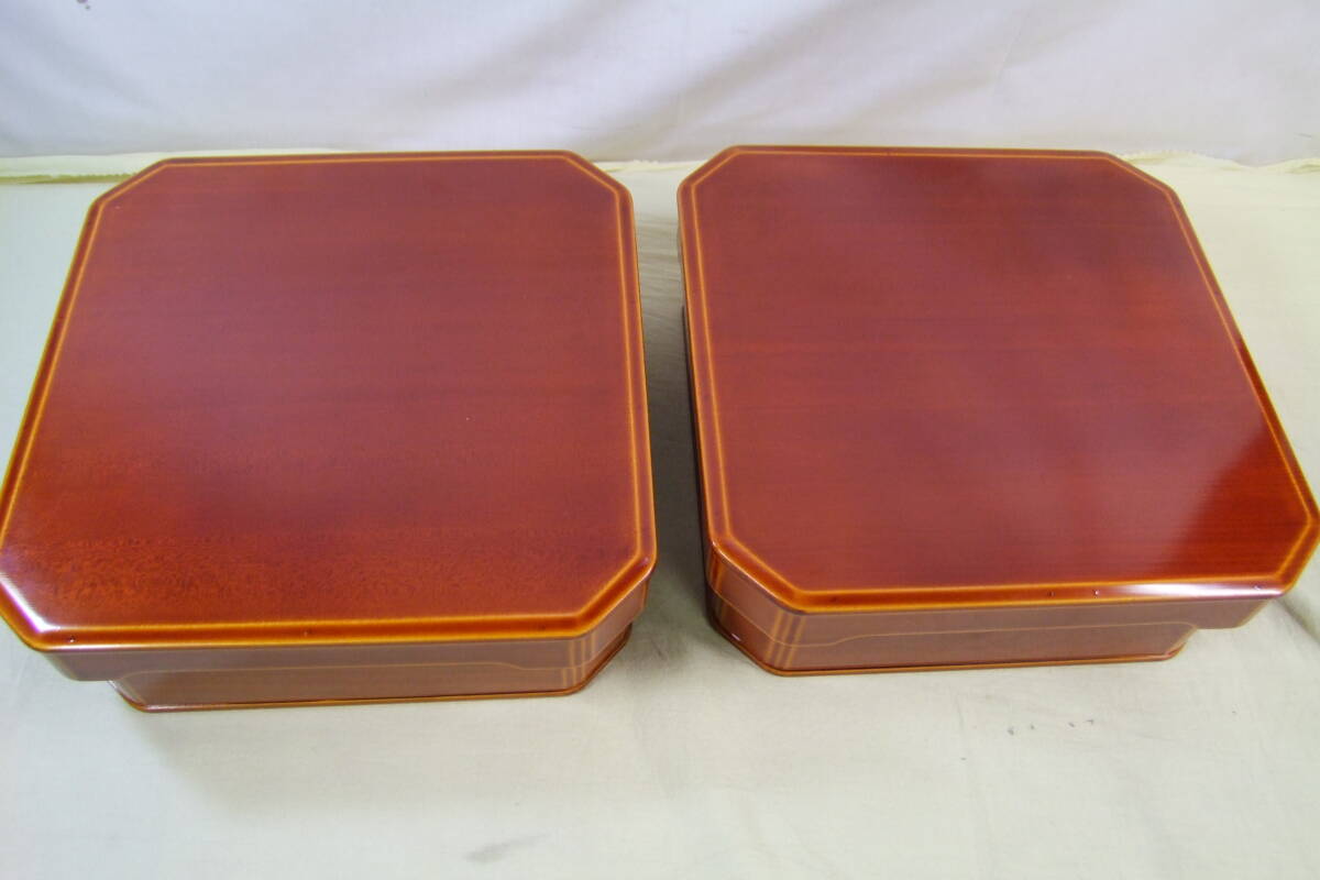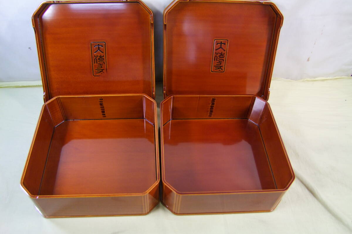 御覧の様な飛騨春慶塗 大徳寺弁当 2客です。 22cm四方、高さ7.5cm程の品です。元の箱はありません。当方の品は一度人の手に渡った物ですので、完品をお求めの方は入札をご遠慮ください。他の品との同梱は出来ません。ゆうパック元払で発送いたします。