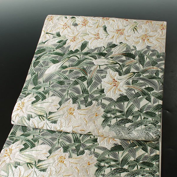 お太鼓や胴部分には白色やオリーブ色や緑色、白緑色、極薄いグレー、裏葉色、柿色、黄色などのお色目で、豪華な百合文が織り込まれております。