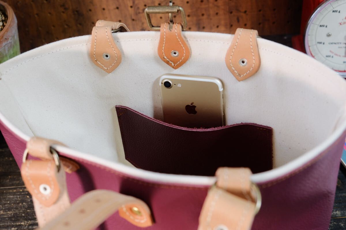 上品なシュリンクのワインレッド系マゼンダ色の牛革、ナチュラルサドルレザーハンドルを中心に使用しクラシカルなデザインに仕立てました。裏地は丈夫な布でお創りしておりますので、耐久性とバッグとしての総合的な軽さを可能にしております。経年変化を楽しめ柔らかでコンパクトな大変扱いやすいバッグです。