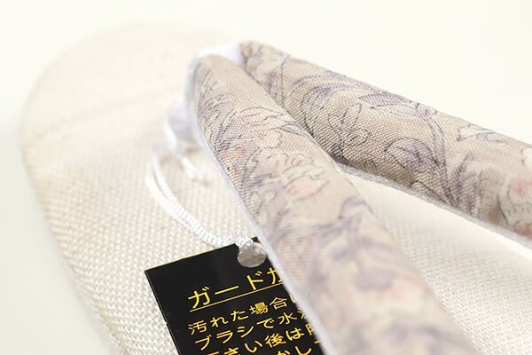 こちらのお品は、青紫色、ピンク色、オフホワイトで唐花模様が染められた鼻緒がすげられております。