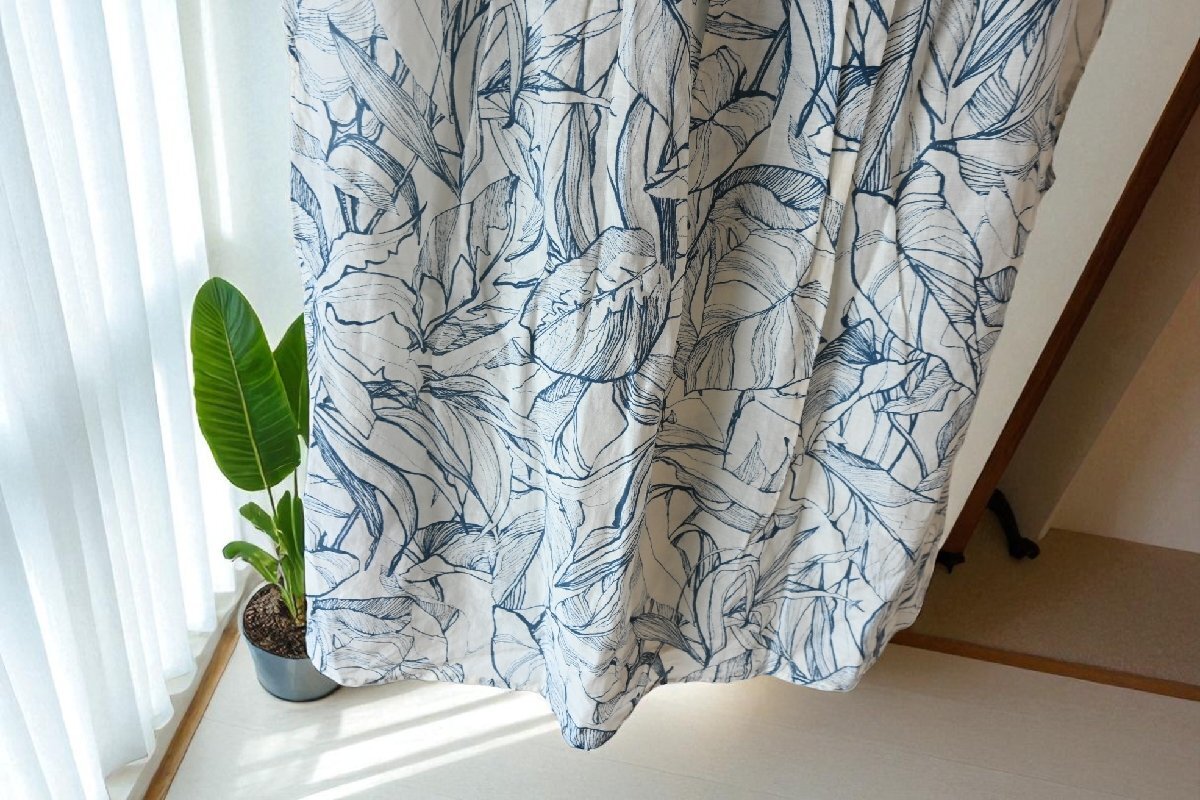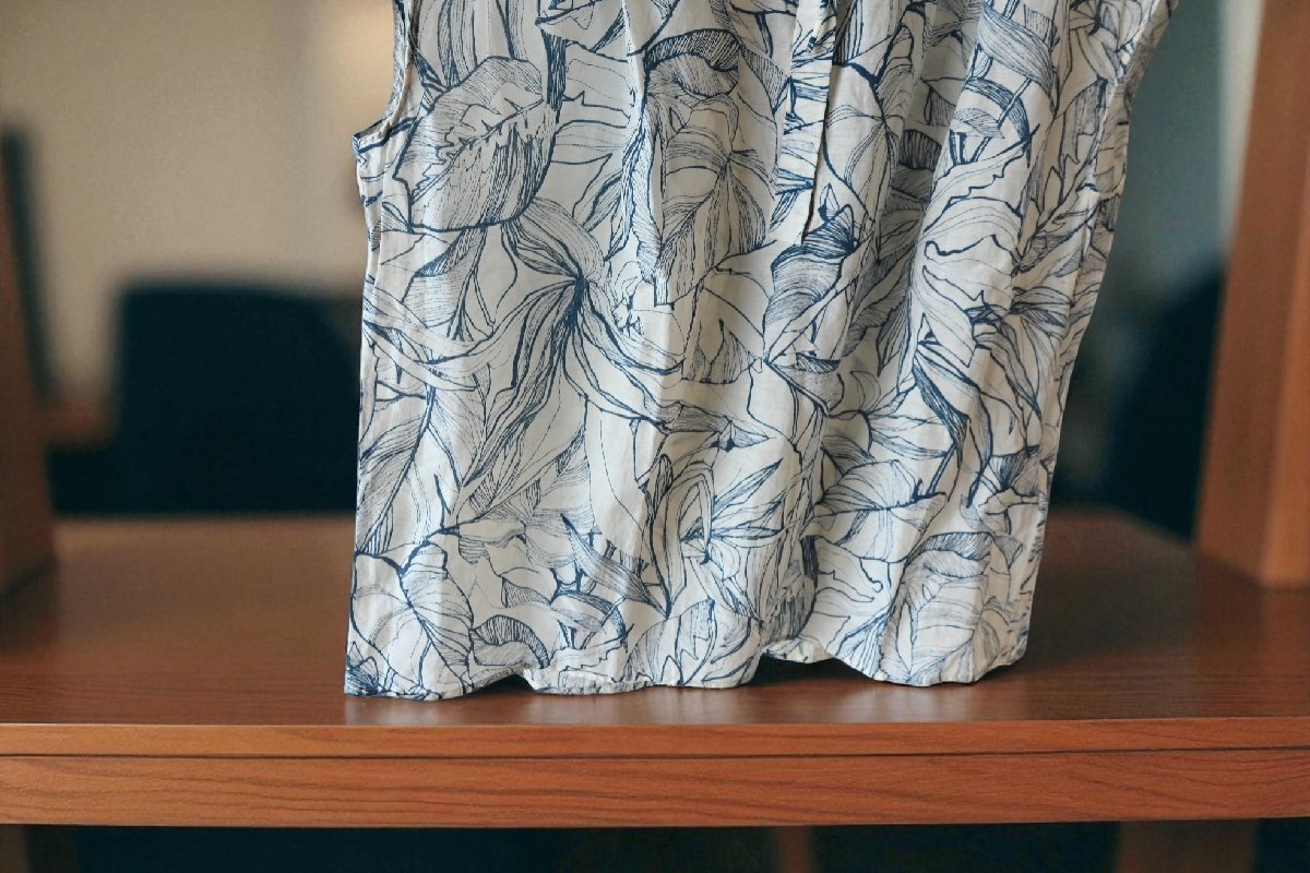 ホワイトベースにブルーのリーフプリントを施し、爽やかな表情に仕上げられています。