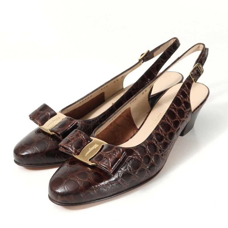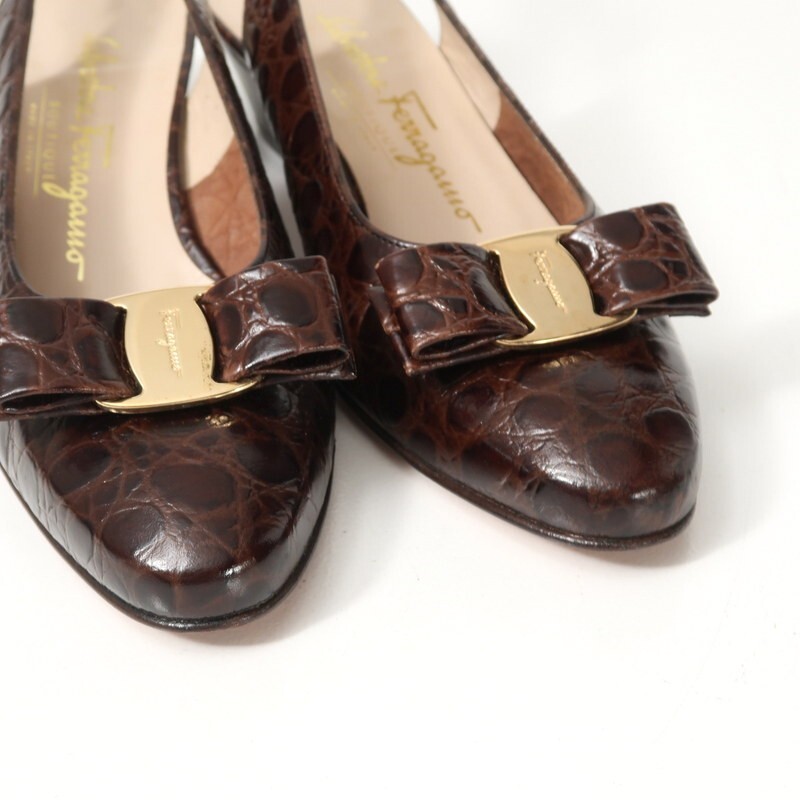 Product name: GS0097*イタリア製 サルヴァトーレフェラガモ Size 6.5B ヴァラリボン クロコ型押しレザー スリングバックミュール パンプス ブラウン