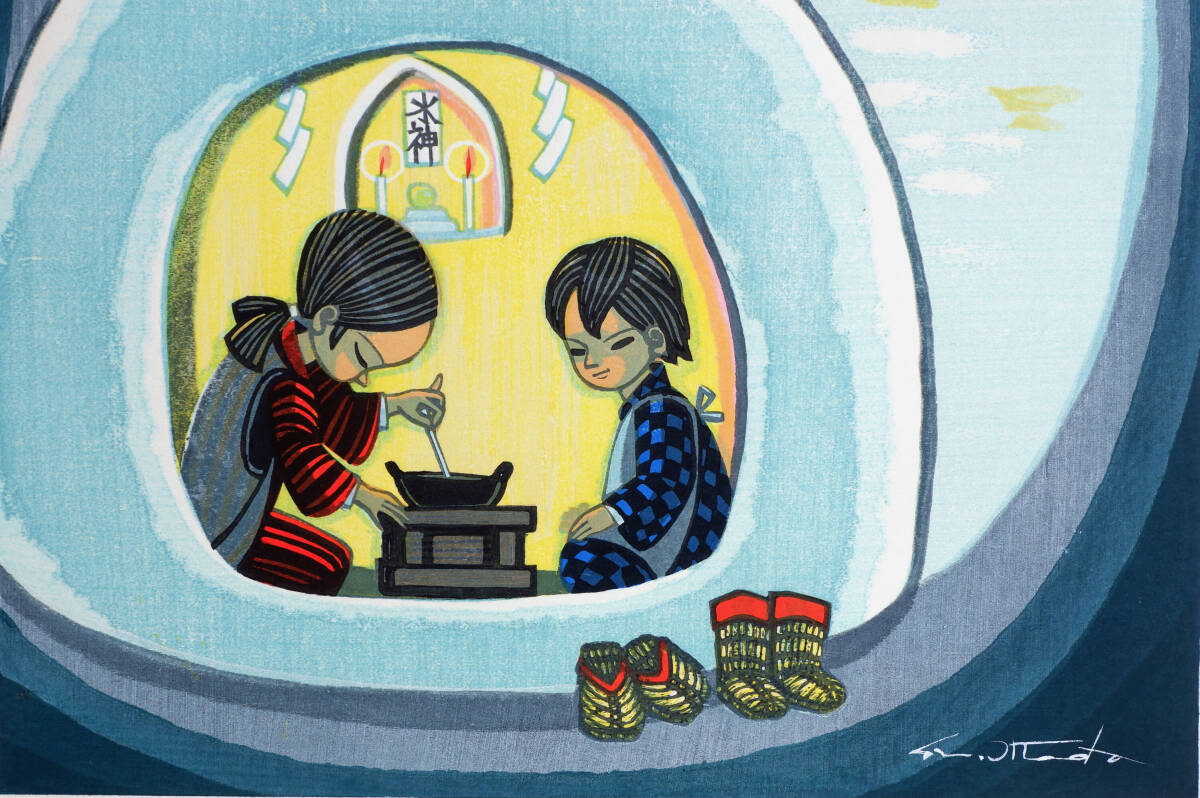 Product name: 池田修三 木版画「かまくらの宵」大判 1993年 25/150 作者ペンサイン // 創作版画 秋田県 にかほ市 横手市 祭 風景画 冬景色 風俗 勝平得之