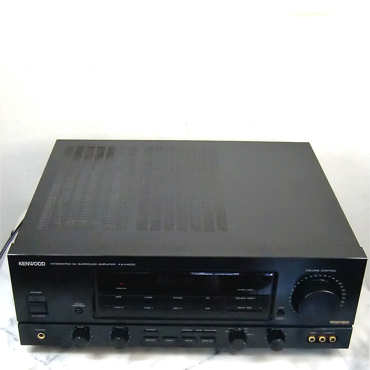 KENWOOD KA-V4000 80W+80W AV AMP 動作美品です。スピーカー出力OK リヤスピーカー出力OK サラウンド効果OK CD入力OK  PHONO入力OK 2CH STEREO OKです。HDMI入出力端子はありませんがHDMI映像出力は→TVに直接接続し音声出力は→直接AMPに入力してご使用が可能です。BYPASS ボタンをおしてからソースダイレクトができます。繊細感・解像度があります。オーディオにも使用できるプリメインアンプです。ボリューム・トーンコントロール・バランスコントロールにガリはありません。AVのサラウンド効果でセンターはRCAピンジャック出力仕様になっています。センタースピーカー端子はありません。USED品できれいな筐体です。リモコンはありません。よろしくお願いします。