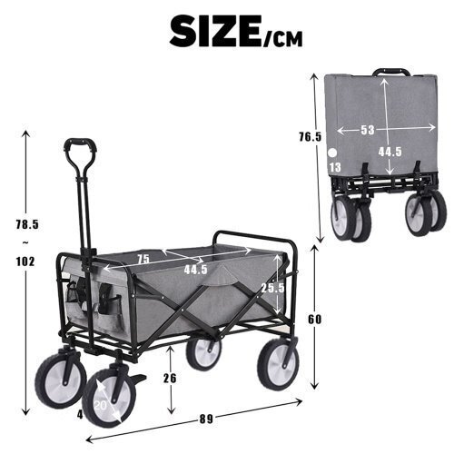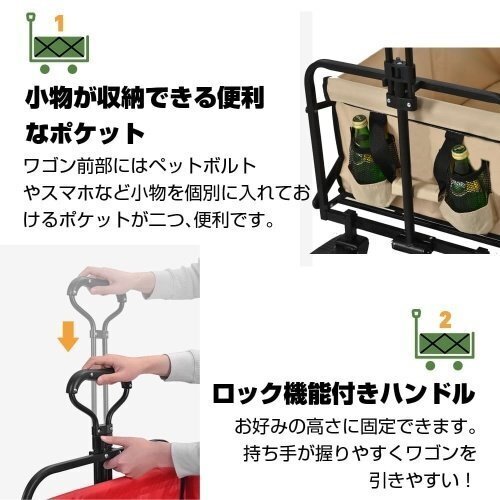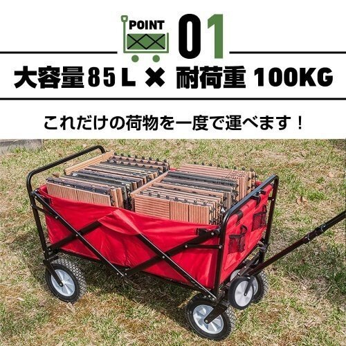 【方向転換自由タイヤ】ワゴンの前輪は360度回転する。【85L大容量耐荷重100㎏】耐荷重約100kg頑丈設計。ギアをたっぷり詰め込んでも安心して運ぶことができる。【折りたたみワンタッチ式】展開・収納がワンタッチでできる簡単設計を採用し、収納便利。【ストッパー付き】スト