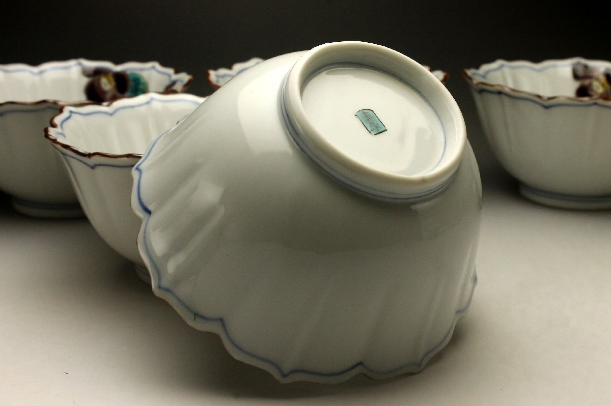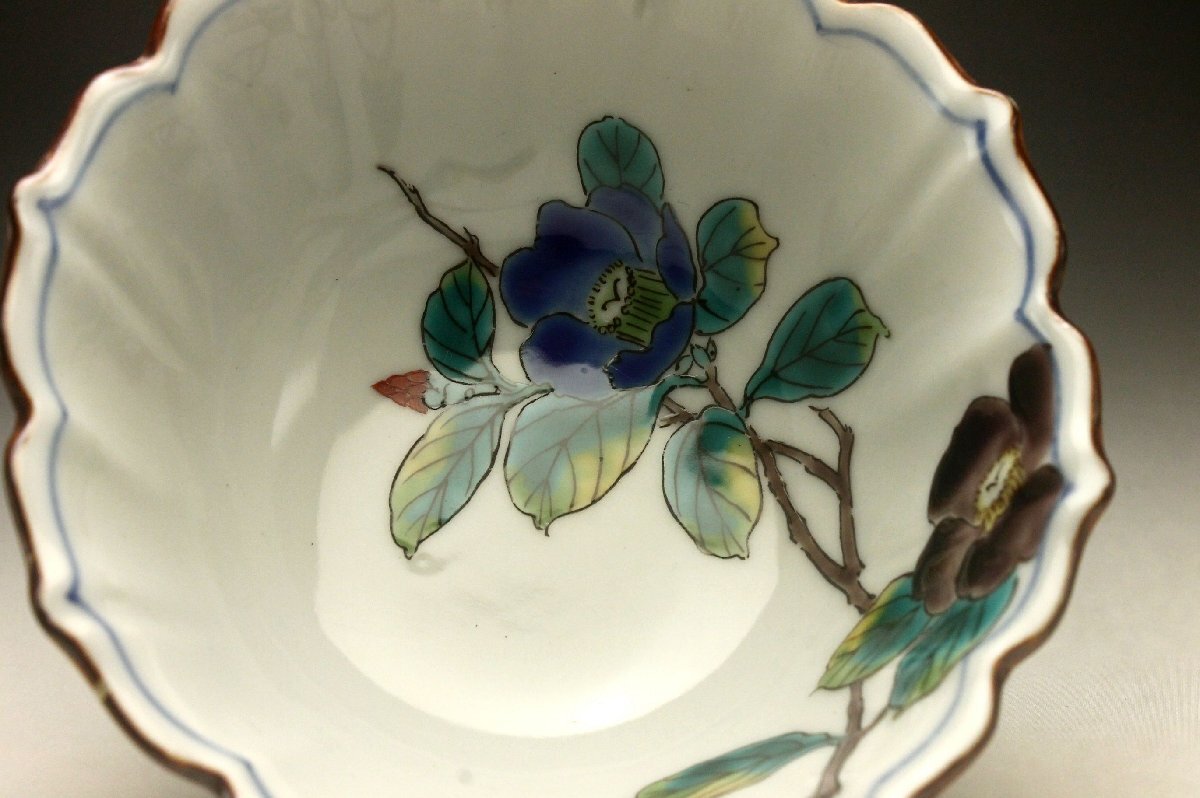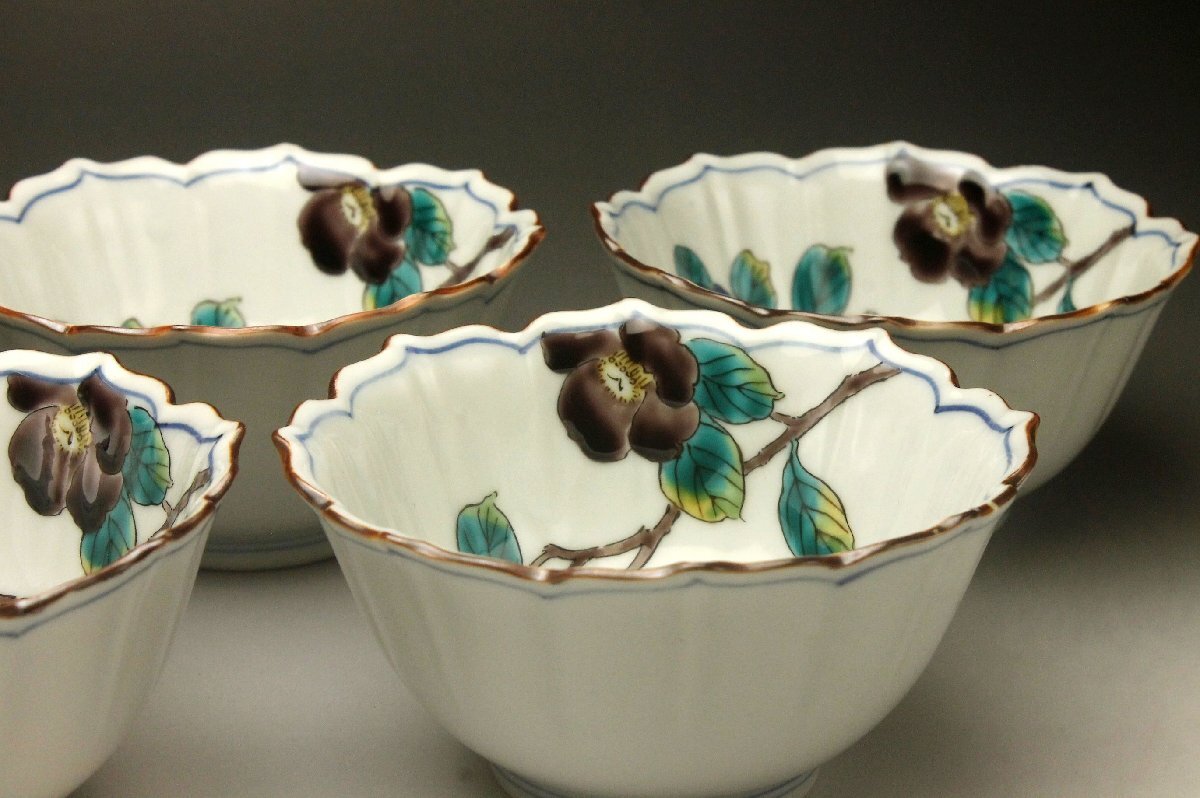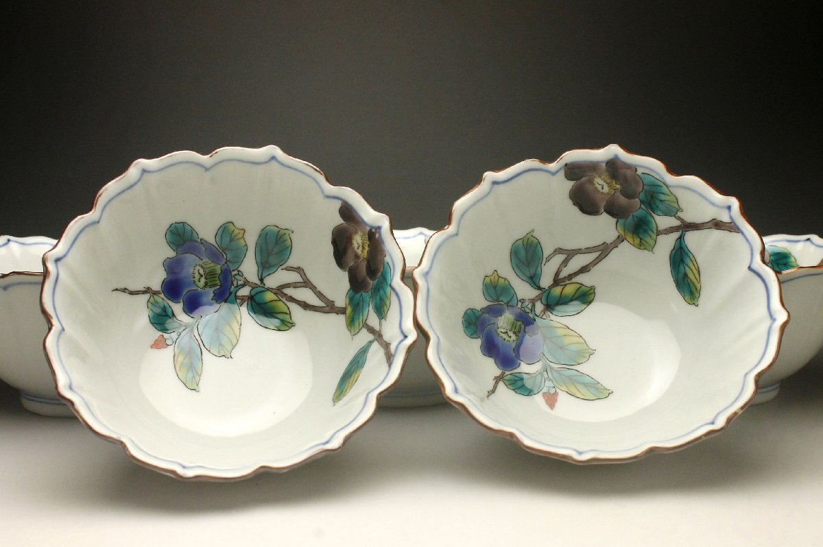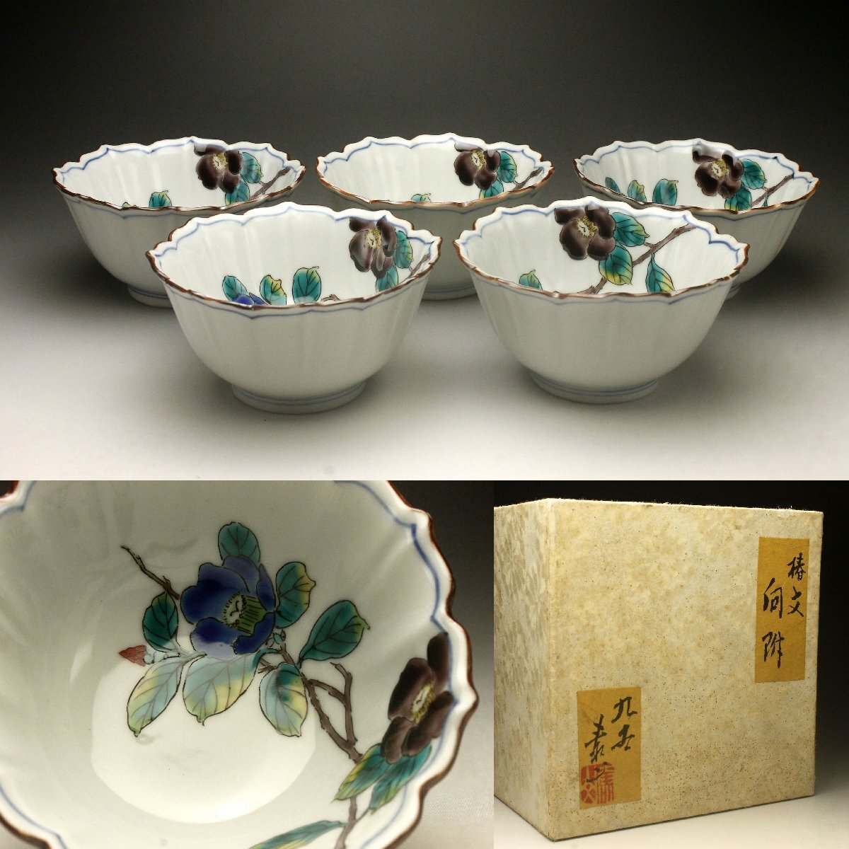 Product name: 【余韻】 九谷焼 泰山窯 色絵椿文 輪花向附揃(5客)★無傷美品 茶道具 化粧箱 逸品<同梱可>