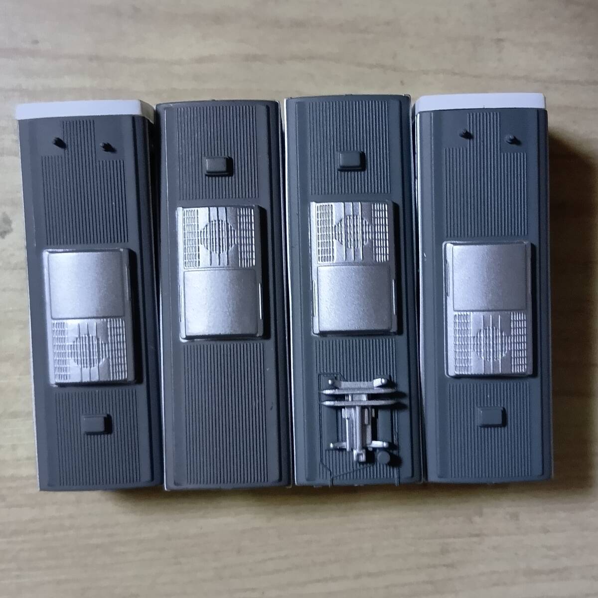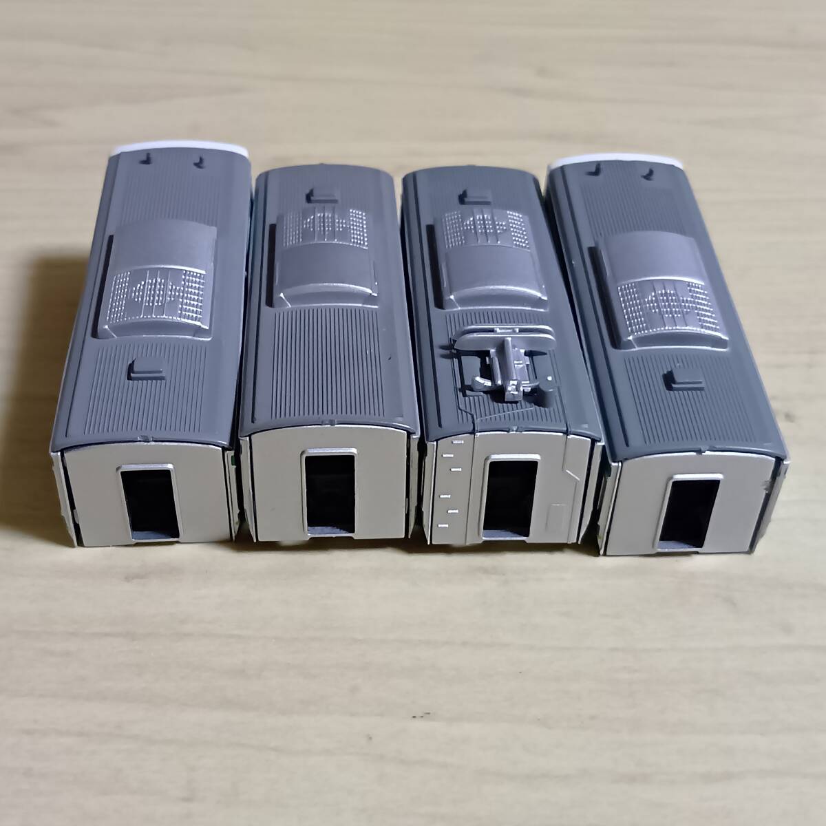 写真のもの送ります。きれいなものもあれば、塗装はげ、色付き、傷、欠品、壊れている(ボディー割れ、スカート割れ他)ものもあります。組間違いや他車部品(妻、レリーフ、パンタグラフ、スカート他)が使われている場合もあります。それらが、ついていない車両もあります。