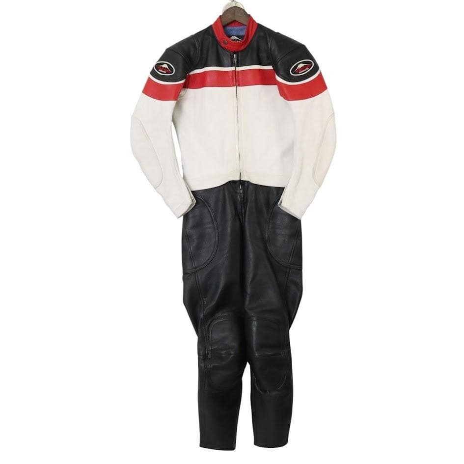 白・赤・黒のトリコロールデザインで、特にフロントの赤ラインと肩のブランドロゴがレーシーな印象を与えます。スポーティかつクラシカルなデザインは、ヴィンテージライダーウェアとしても人気の高いアイテムで、耐久性と安全性を兼ね備えています。サーキット走行はもちろん、ツーリングやコレクション用途にもおすすめ。