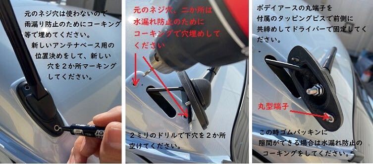 その他の車種でアンテナベースのネジの間が75mm以内であれば 新たに穴を二か所空ければ、       マイクロアンテナ取付できる場合があります。 取付の参考としてください。