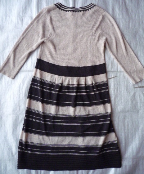上身頃は、ベージュとゴールドスリット糸のミックスで、 スカートは、黒・ベージュ・ゴールドスリット糸の変則ボーダーです。