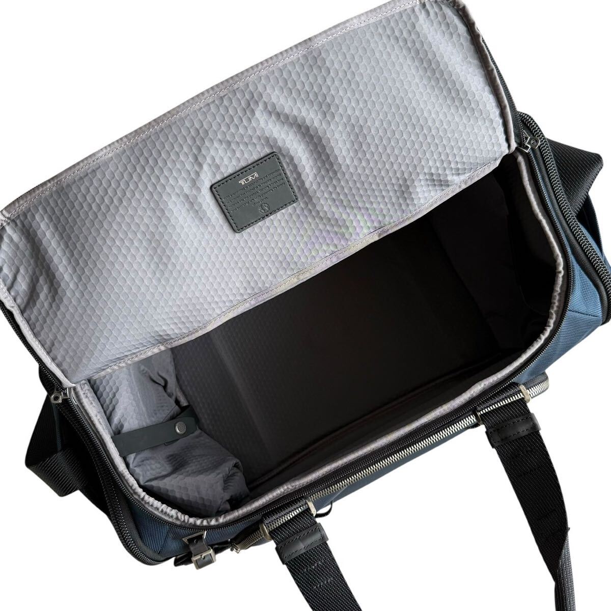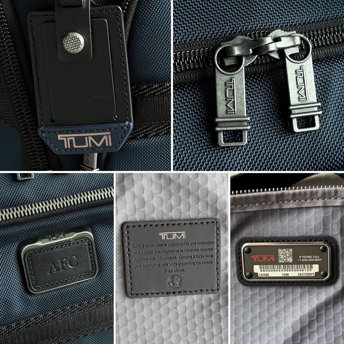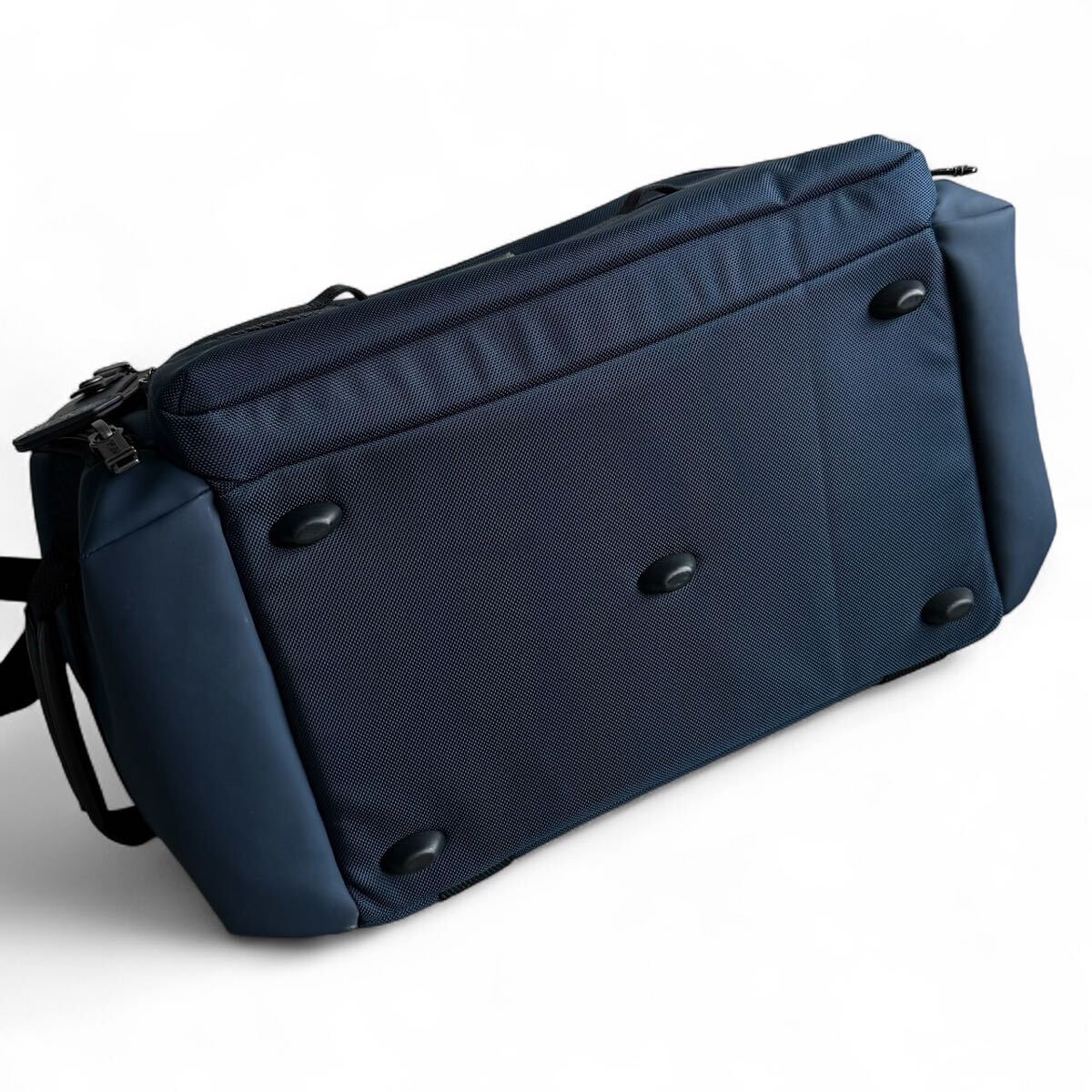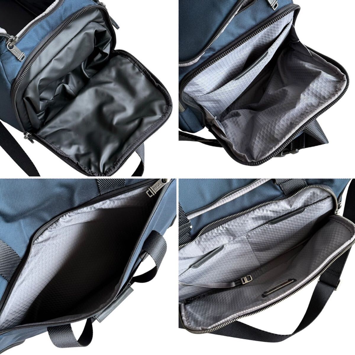 上品なネイビーカラーにブラックのコントラストが映えるデザインで、オン・オフ問わず活躍。全体的に使用感は少なく、未使用級の非常に綺麗なコンディションです。参考定価は115,500円。TUMIらしい機能美と高級感を兼ね備えた、永く愛用できる一本です。