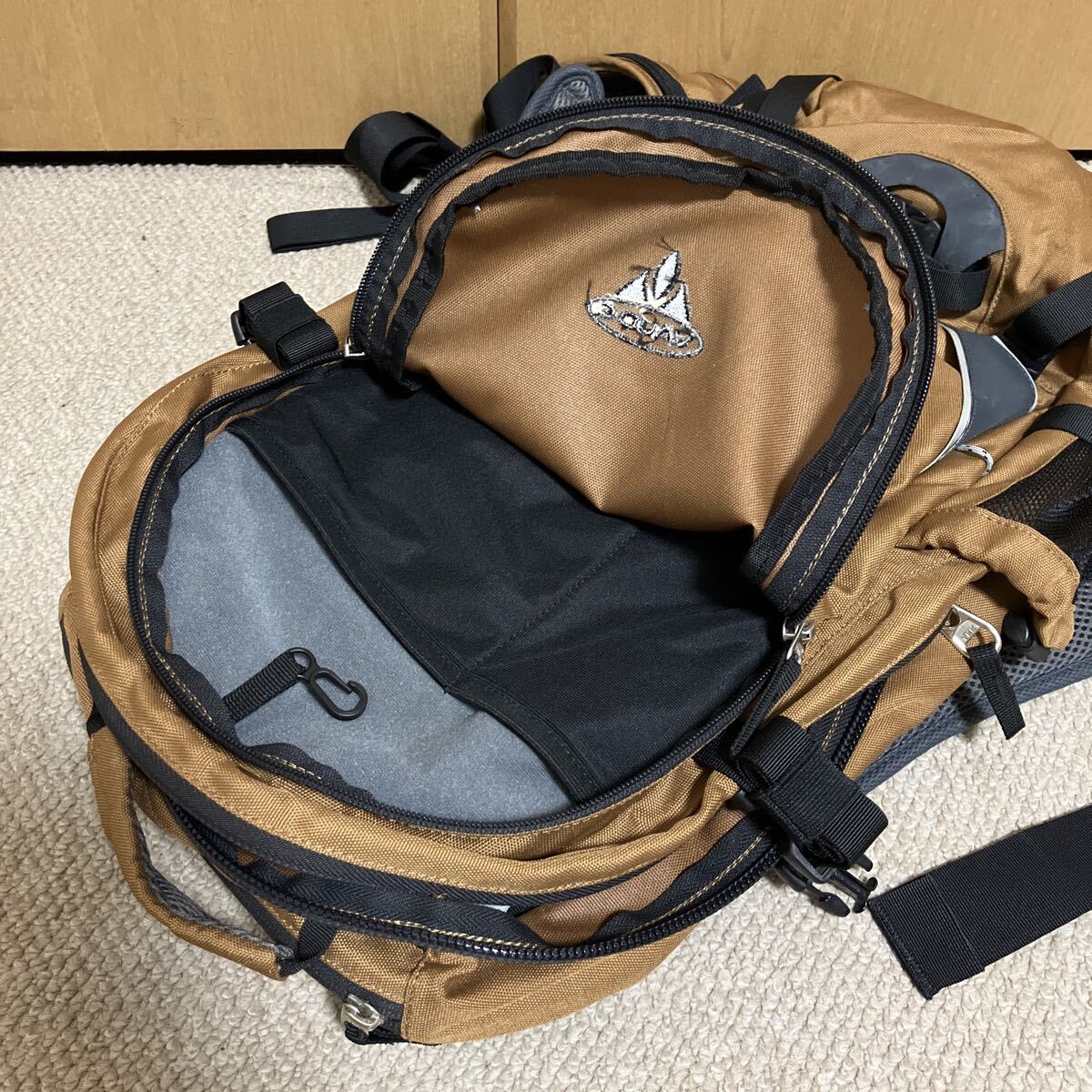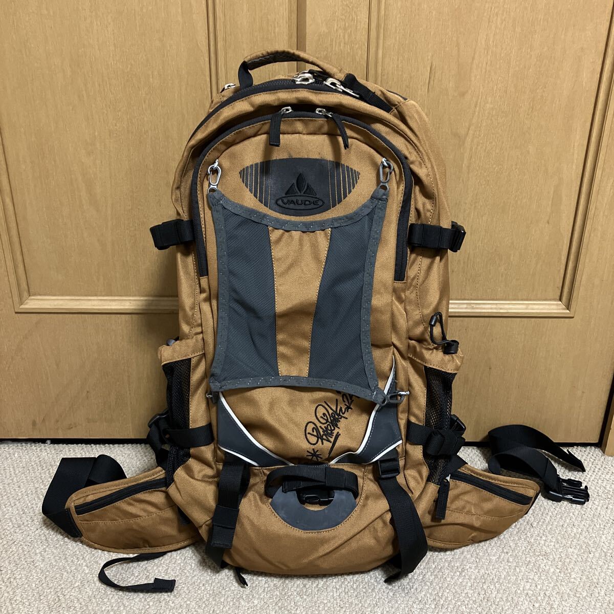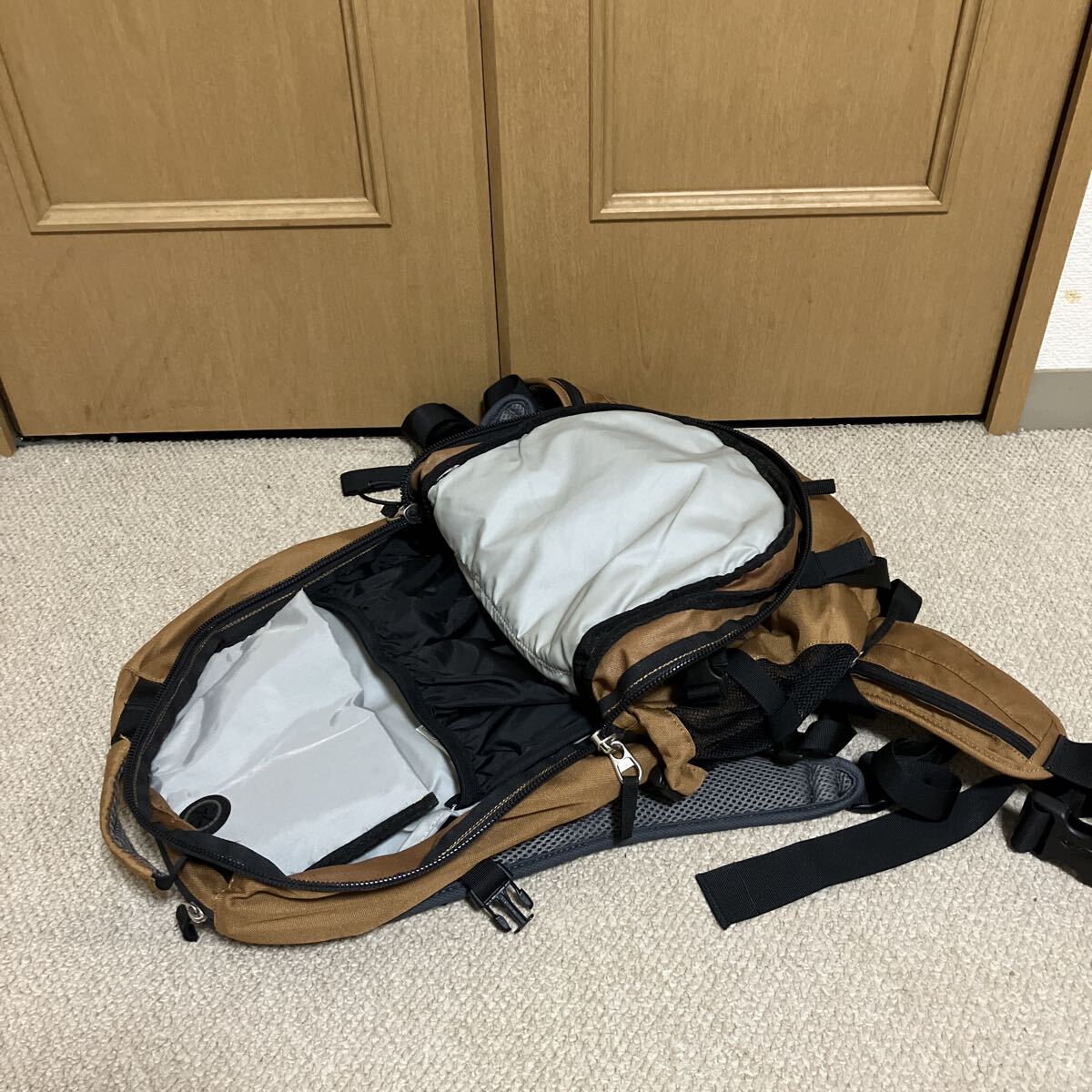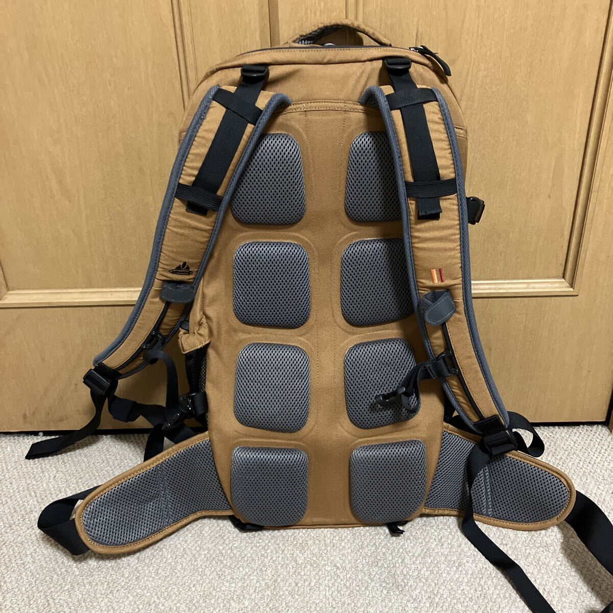 背面に樹脂補強が入っていて、転倒時の背骨の保護機能有り。形状が保持され、荷物が探しやすい利点も有り。