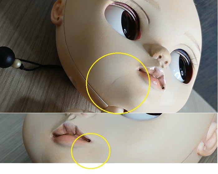 顔の表面に貼ったパテは念入りにやすりがけしてありますが、下から見ると、口の両側にくぼみや境目が確認できます。