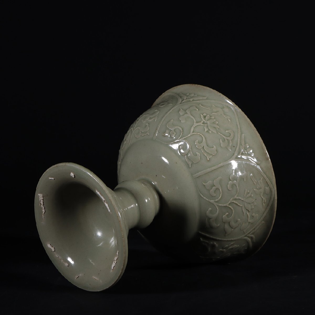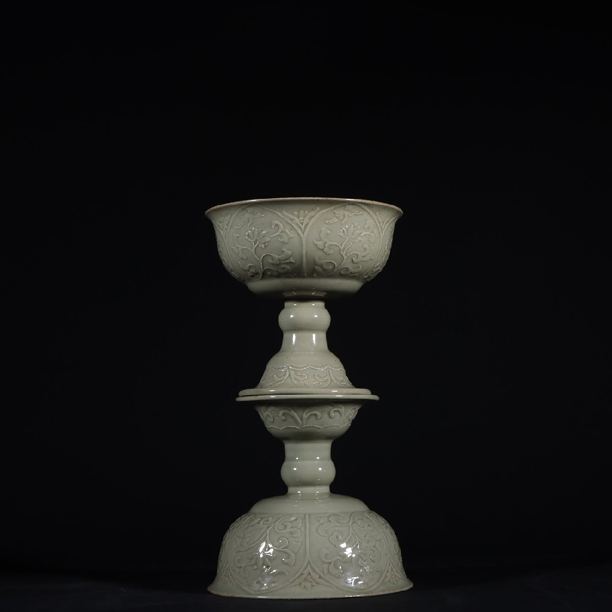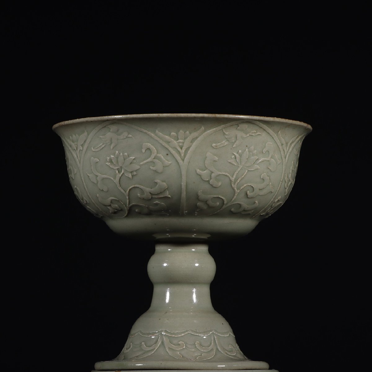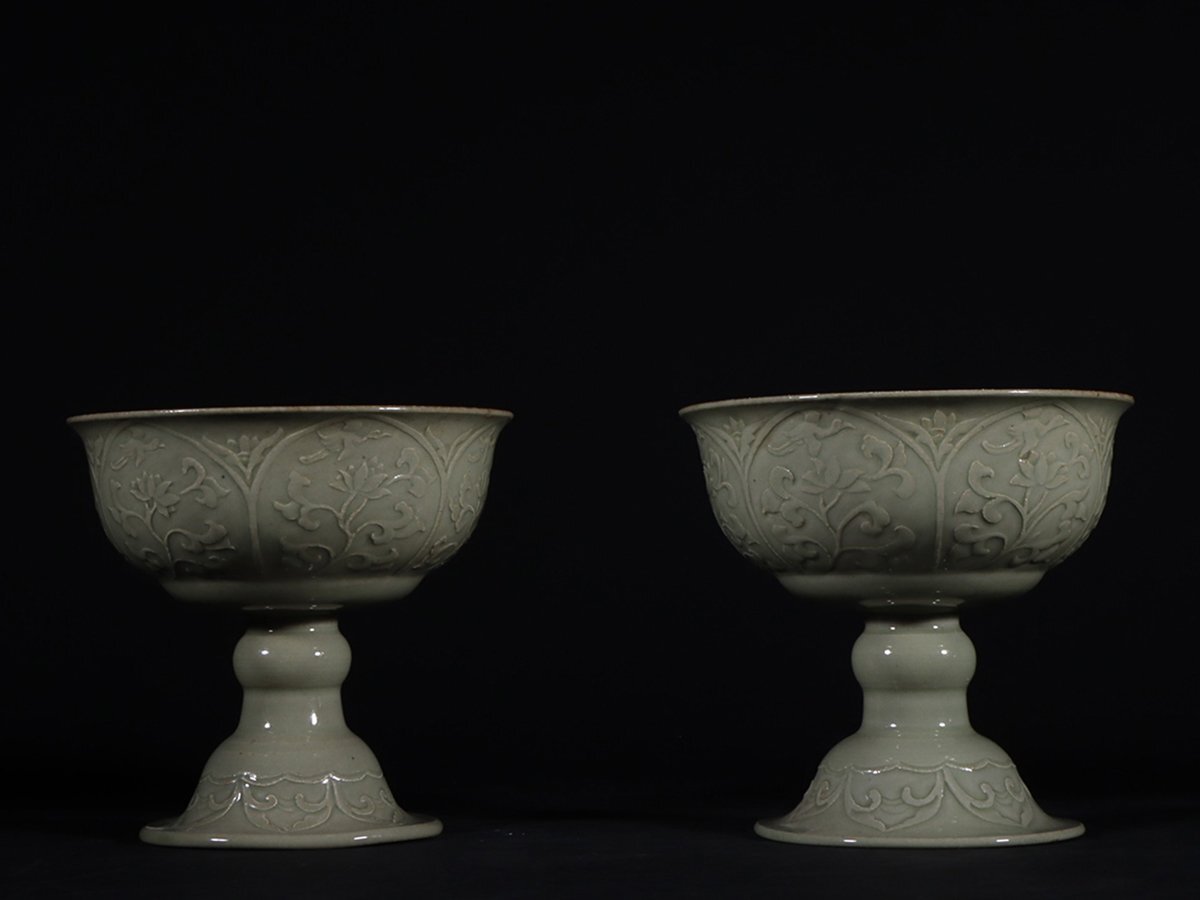 Product name: 【安】五代 越窯秘色青磁高浮彫花卉紋高足杯一対 共箱 唐瓷 染付 古陶瓷 中国古美術 古董品 258