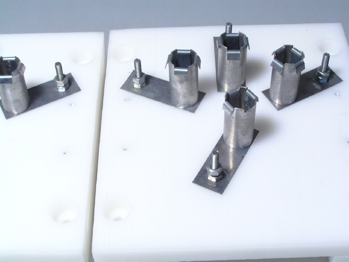 大きさは、140X130mm、テフロン材の厚さは10mm(一部2枚重で20mm)、重さは約500g。 大型管をしっかり固定出来るように作られています(1枚目画像の真空管はオークションには含まれません)。