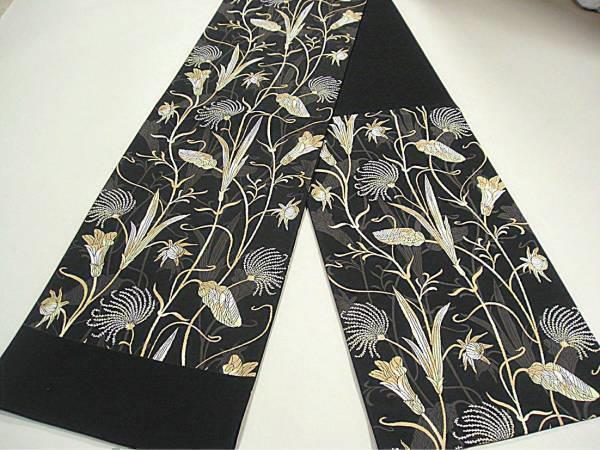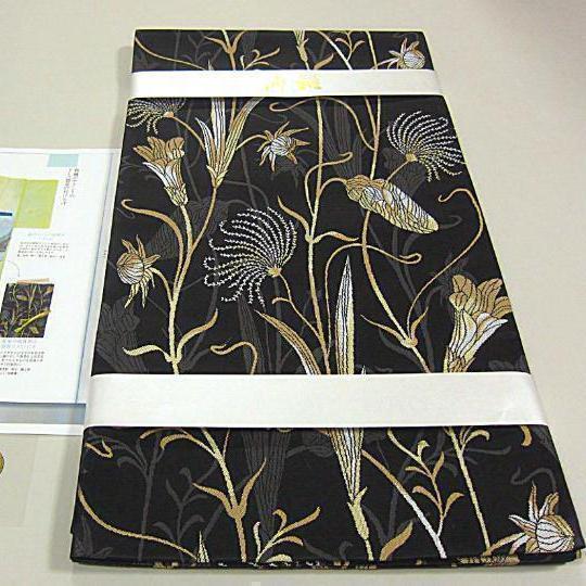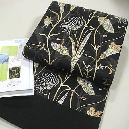 美しいキモノ掲載柄 西陣織高級袋帯です。こちらは、美しいキモノ掲載柄の袋帯です。シックな黒地にススキや百合などの草花を伸びやかに織り出した個性的な袋帯です。美しいキモノなどにも度々掲載されている織元だけあり、ご堪能して頂ける逸品かと思います。 付け下げ・訪問着・色無地などのお着物にいかがでしょうか