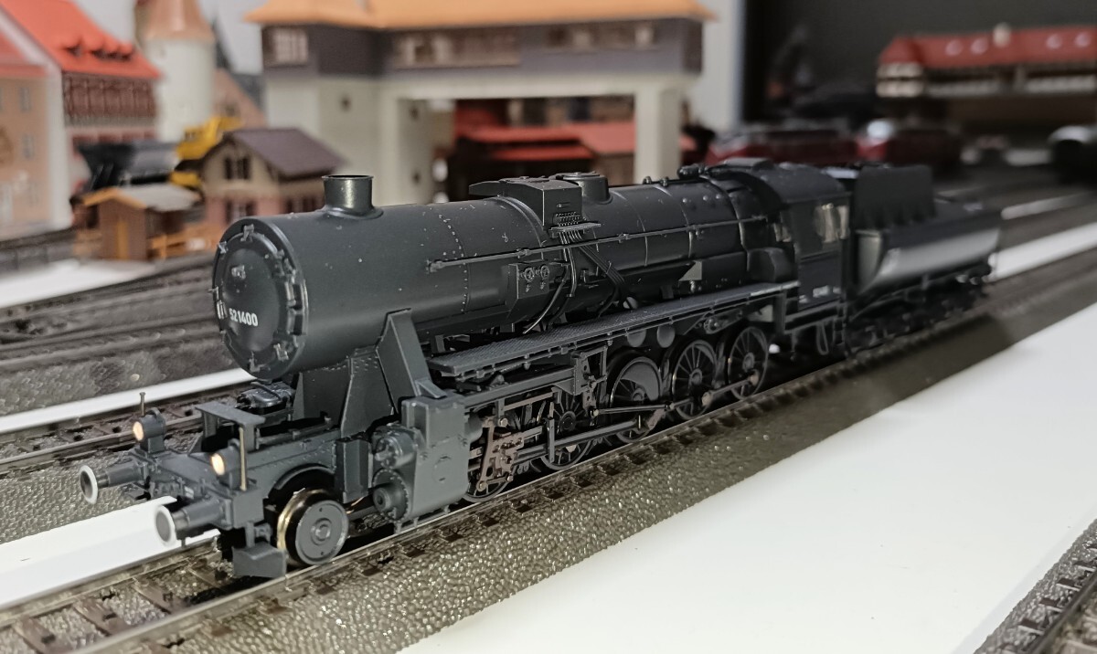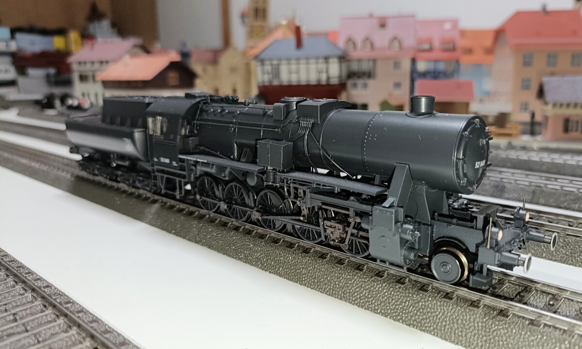 メルクリン 39532 クラス52蒸気機関車です。戦時設計の重量貨物用機関車で大戦末期の1944年から本格的に製造されました。優秀な50型機関車を簡素化した機関車だったので戦時仕様としては耐久性があり、大戦後も各国で長期にわたり使用されました。ダークグレーの塗装が魅力的です。