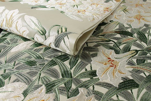 お太鼓や胴部分には白色やオリーブ色や緑色、白緑色、極薄いグレー、裏葉色、柿色、黄色などのお色目で、豪華な百合文が織り込まれております。