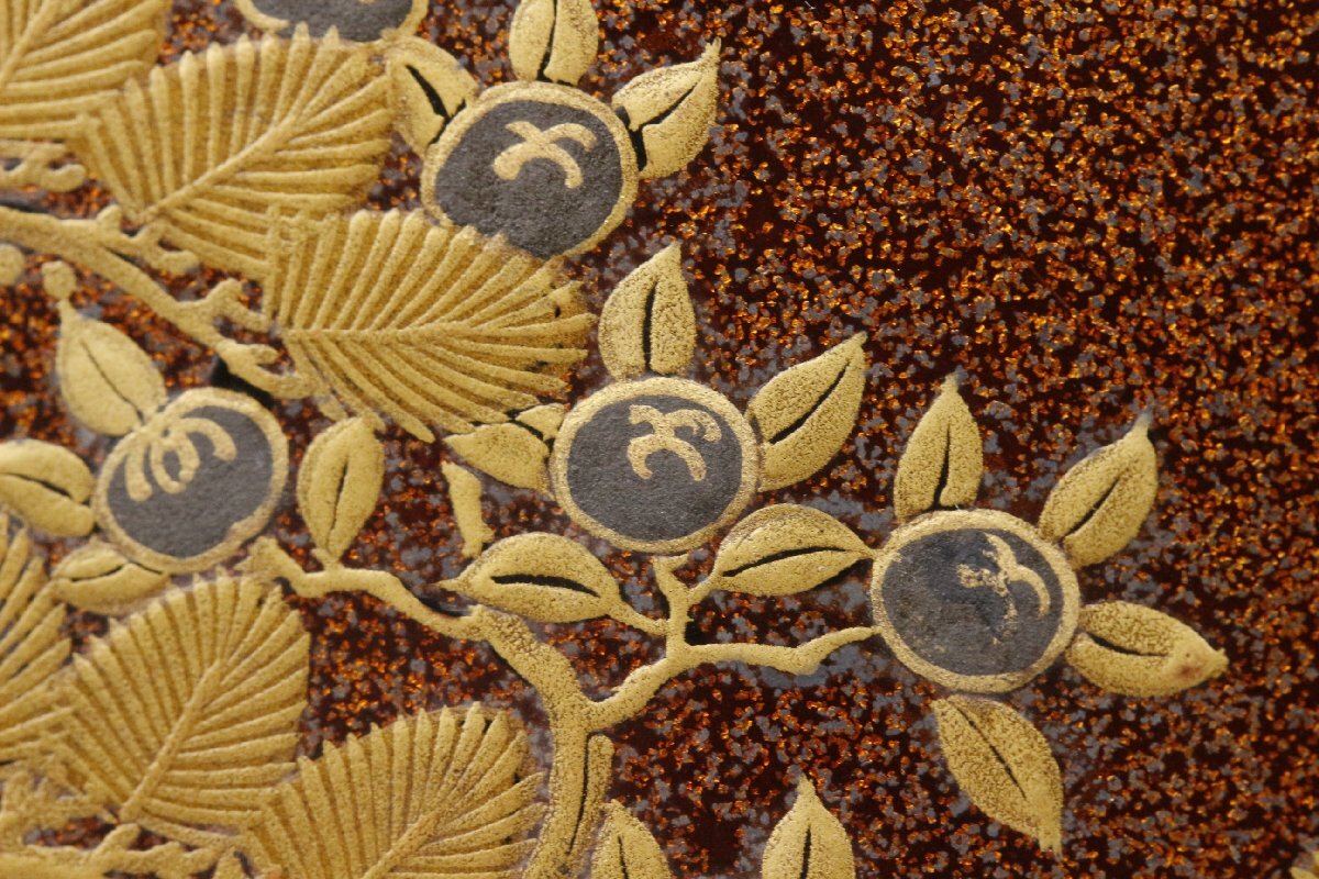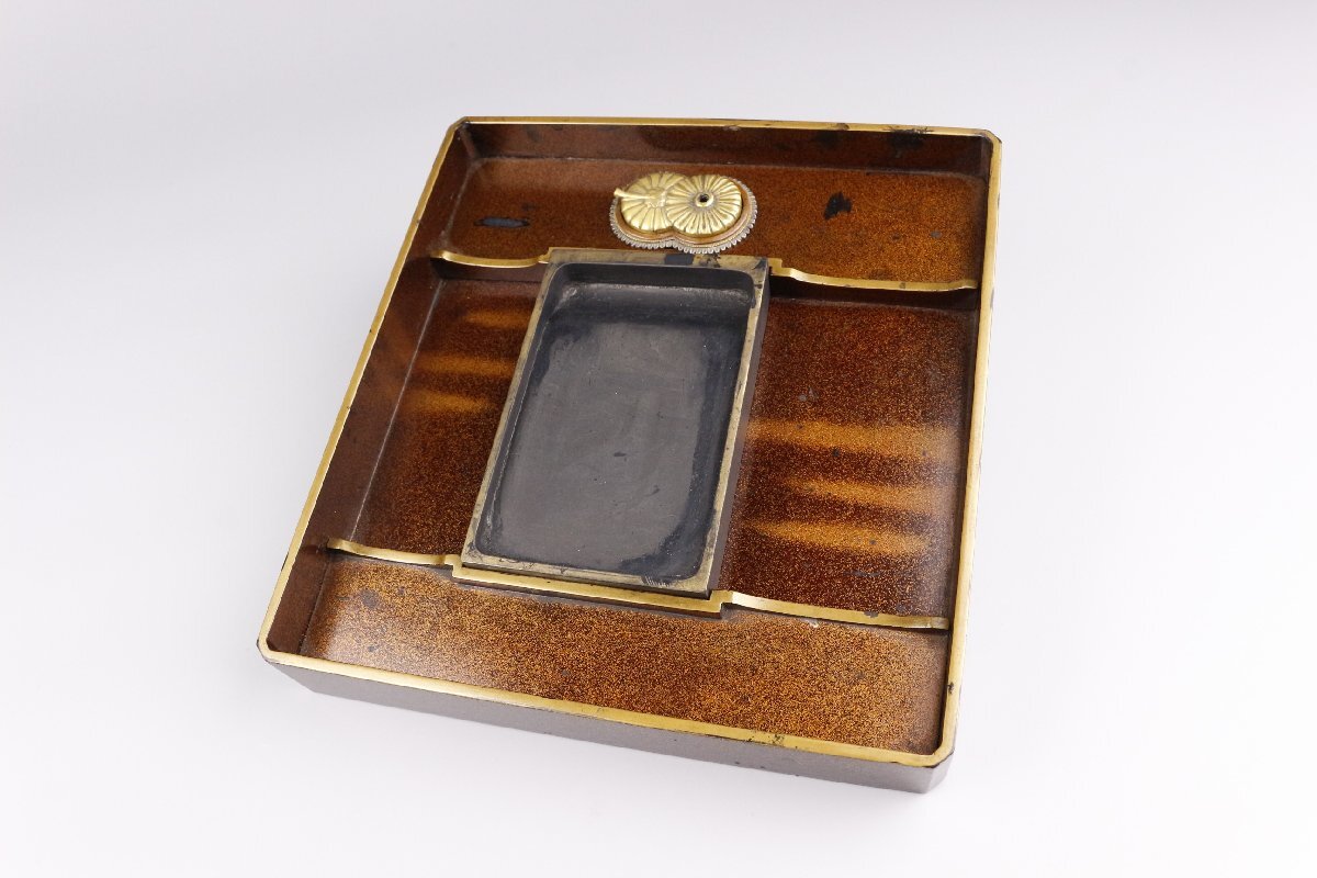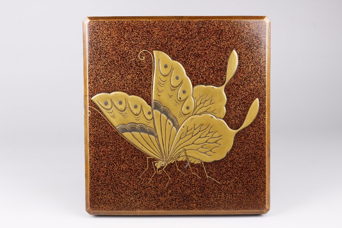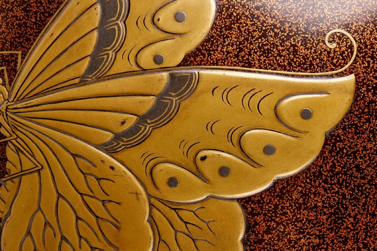 蝶が大きく配された潔い構図が目を引く硯箱です。