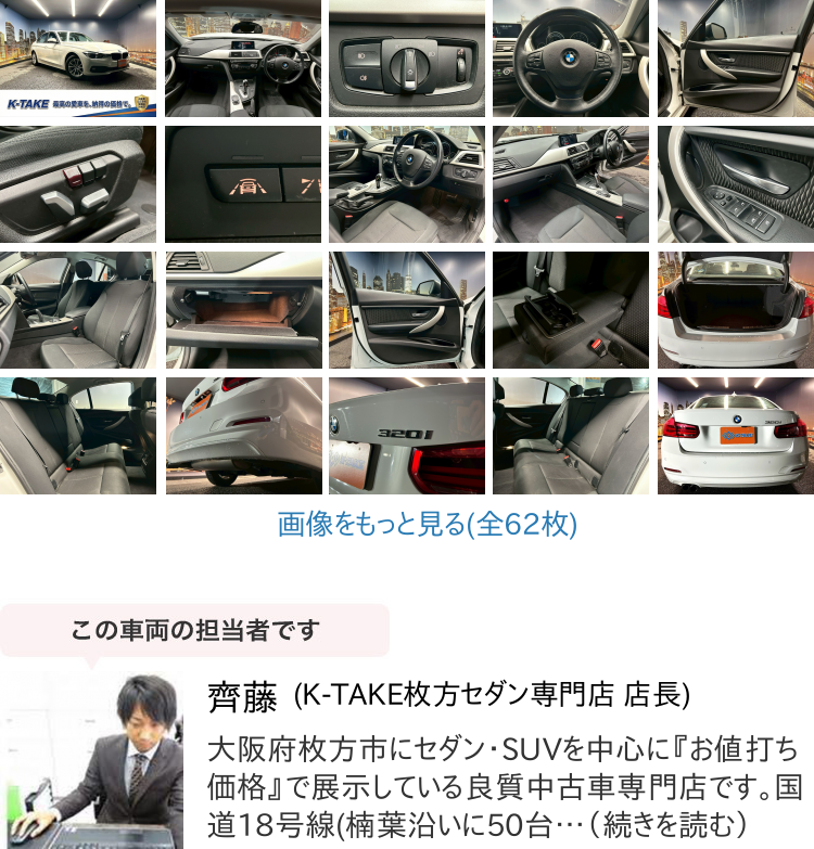 K-TAKE枚方店は国産セダン・SUV・ステーションワゴンを中心に取り扱いしております。趣向性の高い車種になりますので、専門知識を持ったスタッフにてご案内させて頂きます。コーティングやカスタム等はもちろん、任意保険、オートローンまで安心のカーライフをお約束致します。整備、保証などのアフターサービスも当店ですべて行えますのでご安心ください。当社は全国のオークション会場、約160カ所と業務提携を結んでおります。全国60000台以上の中古車を当店でご商談、ご契約、ご納車可能です!