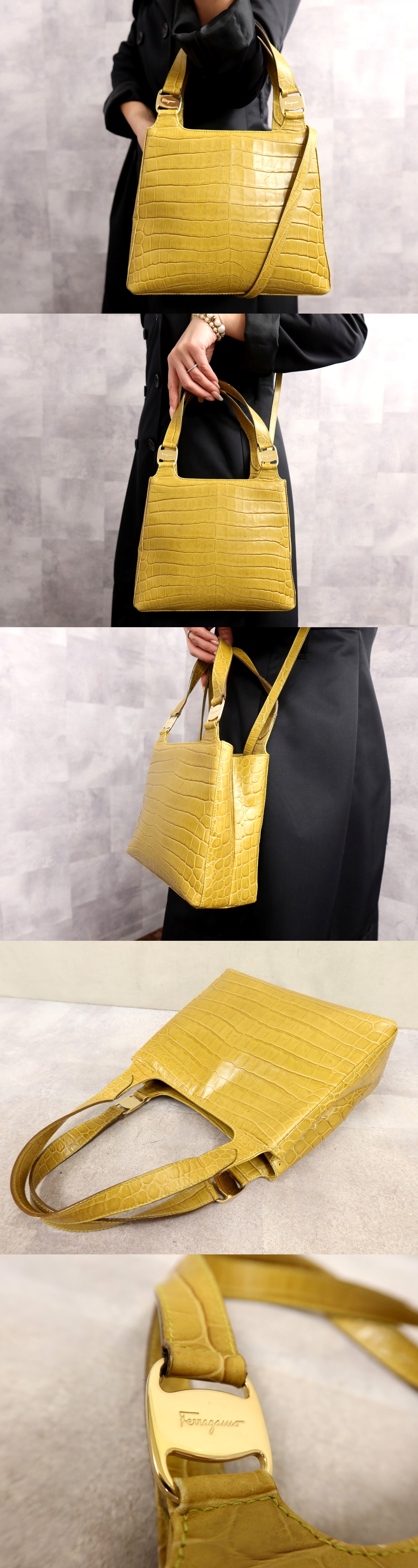 Store ●超美品●Salvatore Ferragamo フェラガモ●ヴァラ●クロコダイル 型押し レザー 本革●2way ハンド バッグ●イエロー系●G金具●Js65628