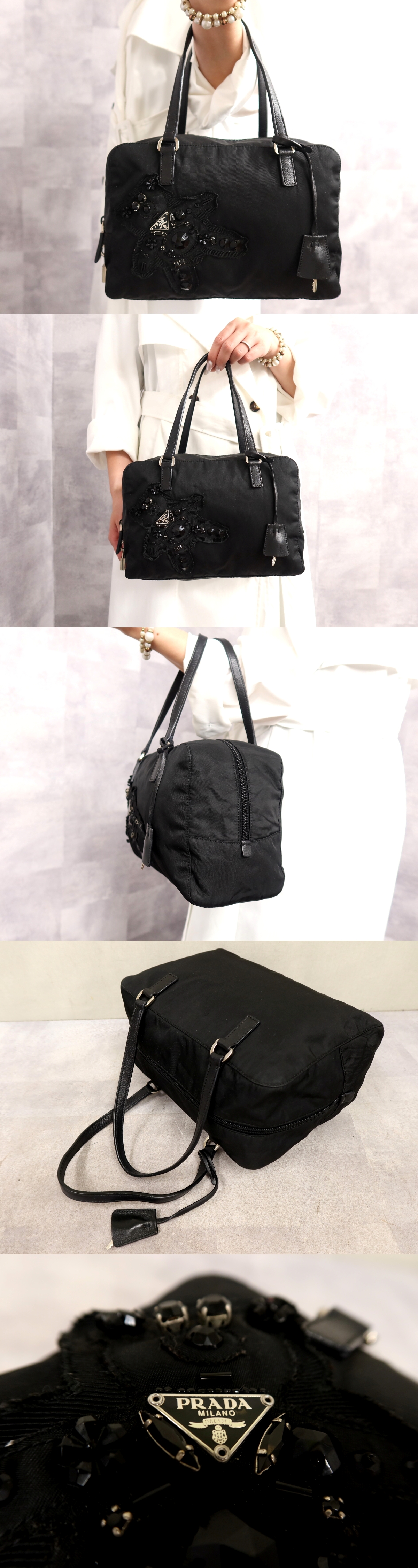 Product name: ●美品●PRADA プラダ●イブニングベア●ビジュー●ポコノ ナイロン カーフ レザー 本革●ハンド バッグ●黒●SV金具●イタリア製●Js66984