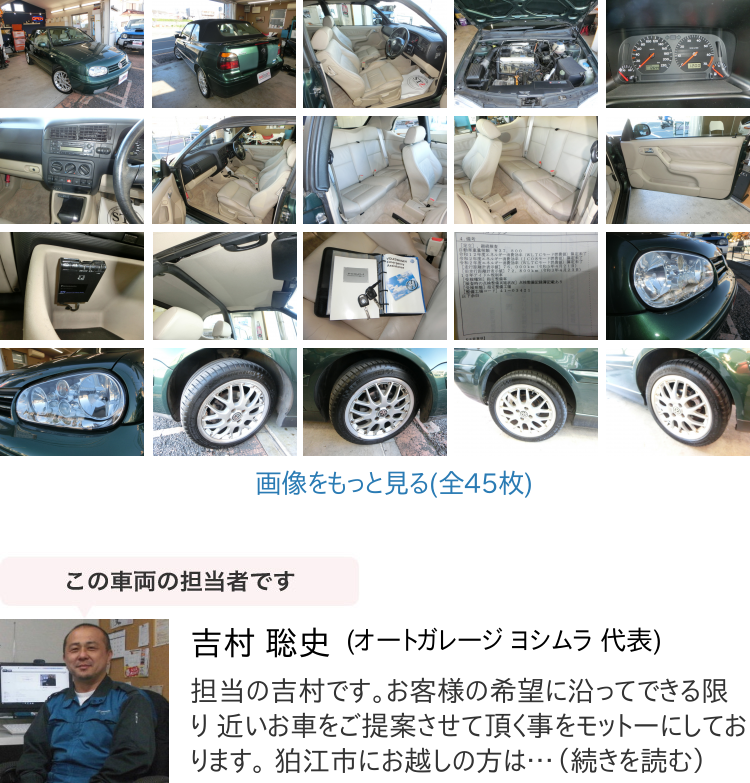 車両状態コメントご覧頂きありがとうございます。既に希少なゴルフカブリオになりました。最近ではこのモデルも価格が上がり始めています。今後は下がる事はないと思われますので是非このチャンスを逃さないでください!走行は不明になりますがかなり程度の良い個体です^^旧車はオリジナルパーツが着いてるかボディーや機関の状態が重要です!