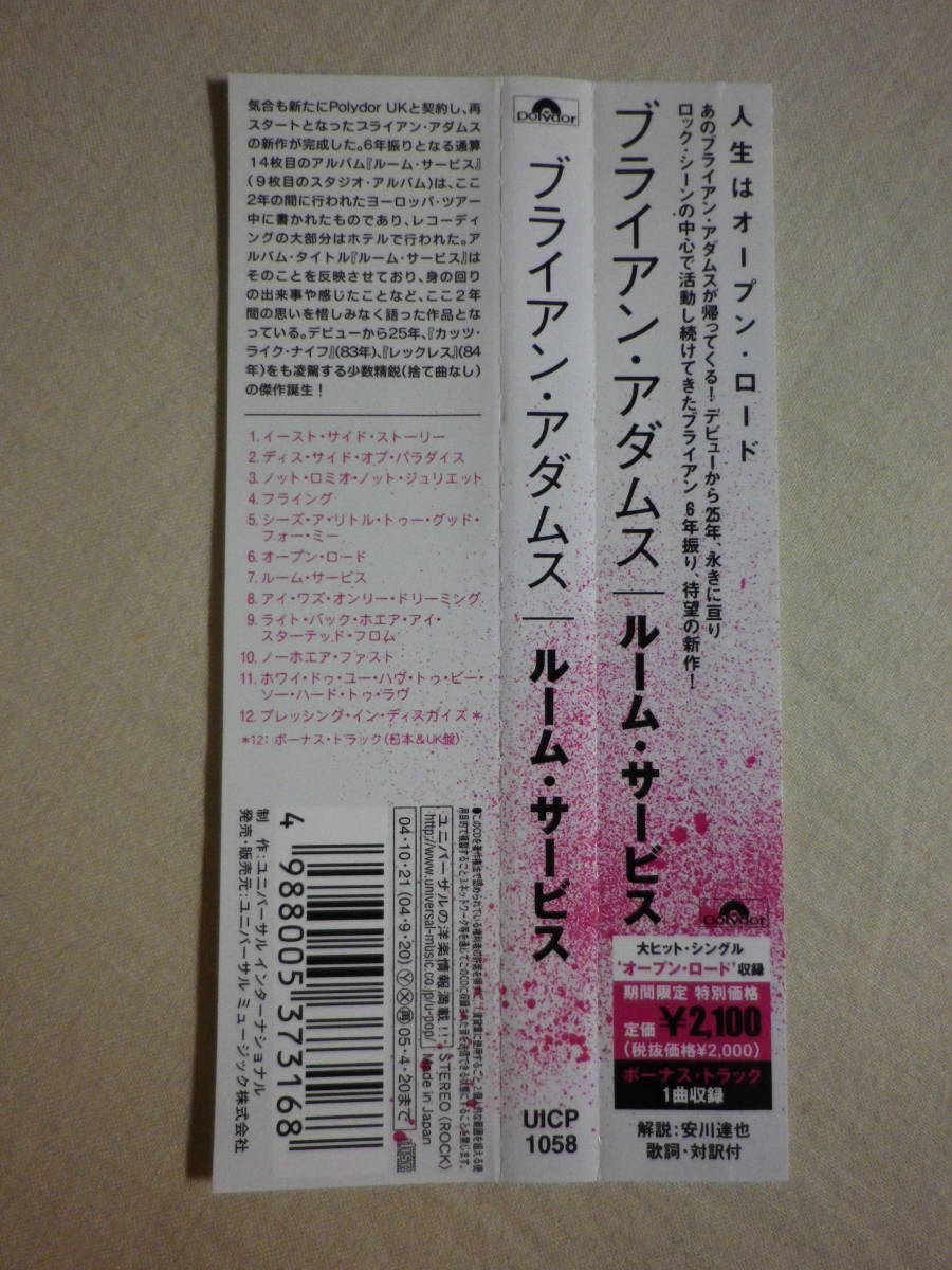 Product name: 『Bryan Adams/Room Service+1(2004)』(2004年発売,UICP-1058,国内盤帯付,歌詞対訳付,Open Road,Flying,This Side Of Paradise)