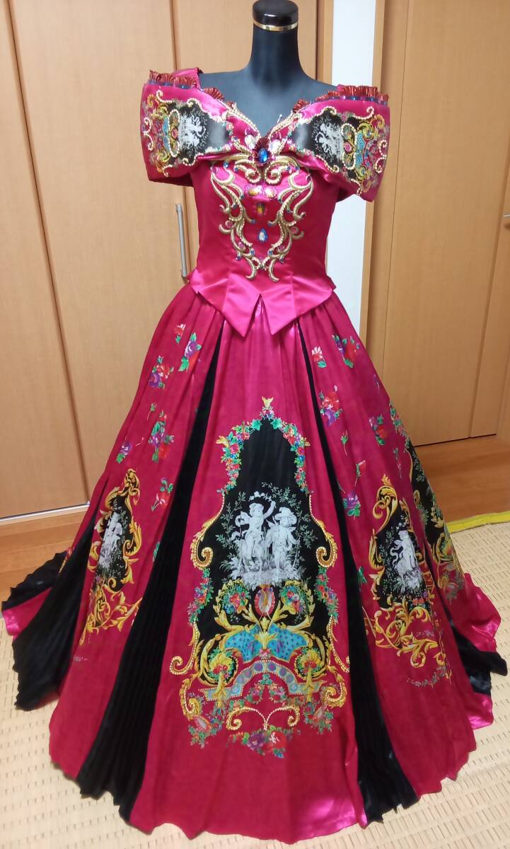●ジャガード織のようなバラ柄模様がプリントされた艶やかなサテン地に、天使や花々、文様調の絵画が描かれた、ゴージャスかつクラシックなドレス。ブレードレース、ビジュー、ビーズ、スパンが施され、印象的でぱっと人目を引きます。