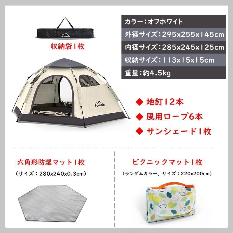 【付属品】:地釘12本、風用ロープ6本、サンシェード1枚、六角形防湿マット1枚(サイズ:280x240x0.3cm)、ピクニックマット1枚(ランダムカラー、サイズ:220x200cm)、収納袋1枚(ランダムカラー)