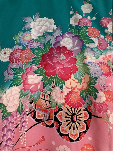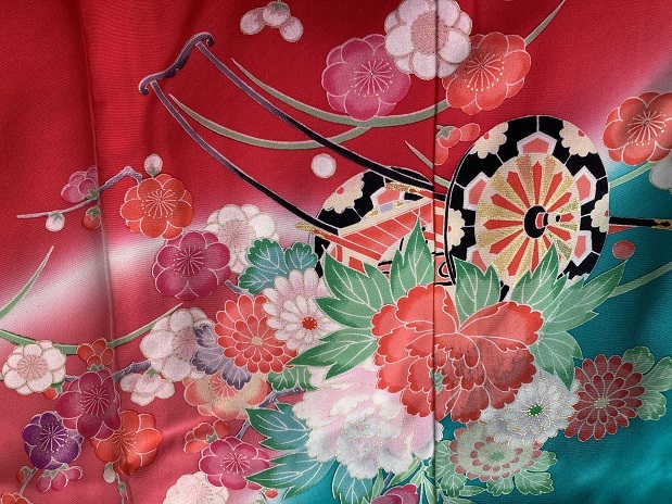 38.昭和レトロ◆絹・中古◆可愛い御祝着 健やかな成長 扇面に菊花梅 花車づくし・・・◆丈96センチ 裄47センチ 袖55センチ