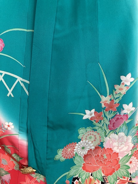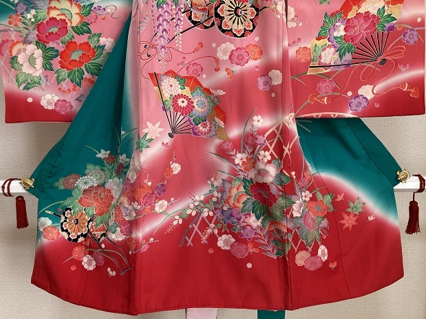 Product name: 38.昭和レトロ◆絹・中古◆可愛い御祝着 健やかな成長 扇面に菊花梅 花車づくし・・・◆丈96センチ 裄47センチ 袖55センチ