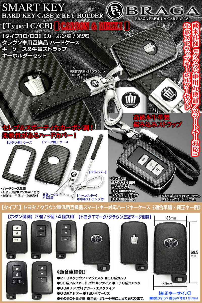 タイプ1C/CB(210系クラウン/210系マジェスタ】《カーボン調/光沢》スマートキー対応ハードケース キーケース&クラウン王冠エンブレム付牛革ストラップ キーホルダーセット
