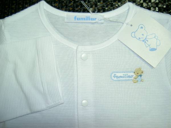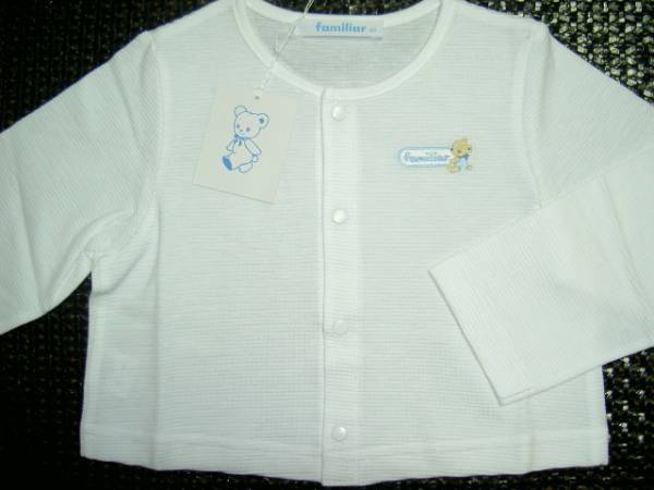 た 新品本物即決 80cm ファミリア familiar 長袖カーディガン 日本製 綿100% ホワイト ブルー familiarロゴ入り ファミちゃん