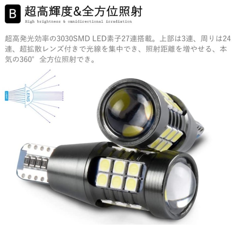 【超高輝度全方位照射】超高発光効率の3030SMD LED素子27連搭載。上部は3連、周りは24連、拡散レンズ付きで光線を集中でき、照射距離を増やせる、本気の360°全方位照射でき。市販のハロゲンより省エネルギーの上で、明るさは大幅にアップ!