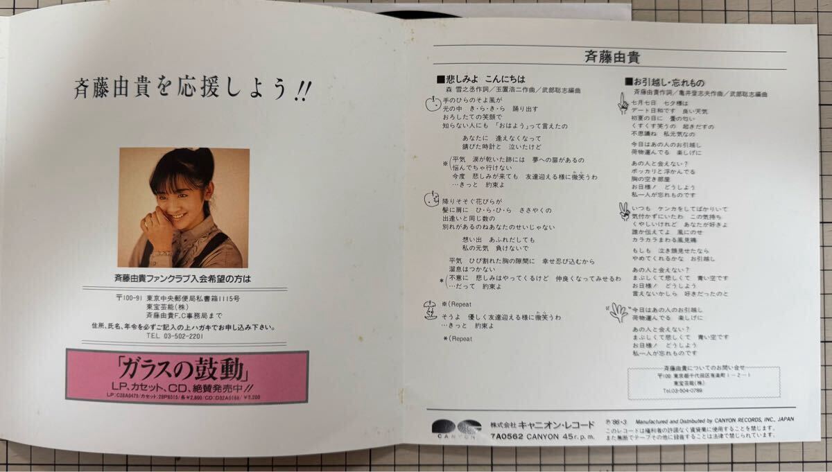 即決◆斉藤由貴/悲しみよこんにちは/お引越し 忘れもの (美盤EP)ピンナップ付「めぞん一刻」主題歌、玉置浩二