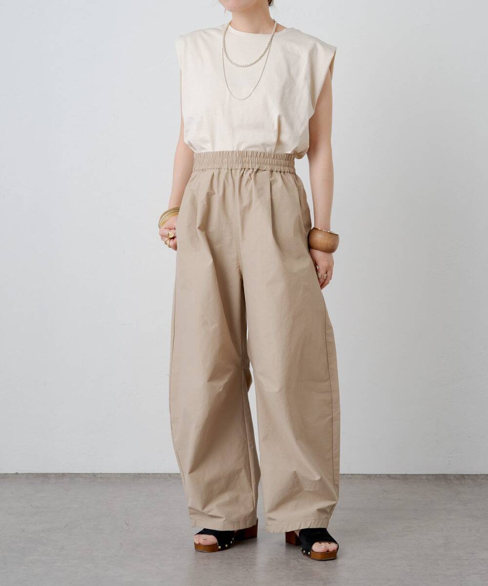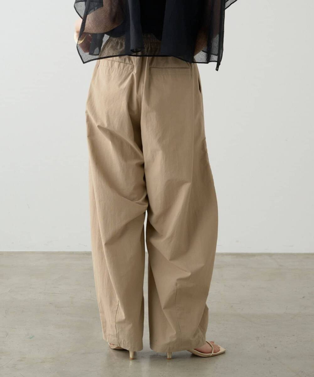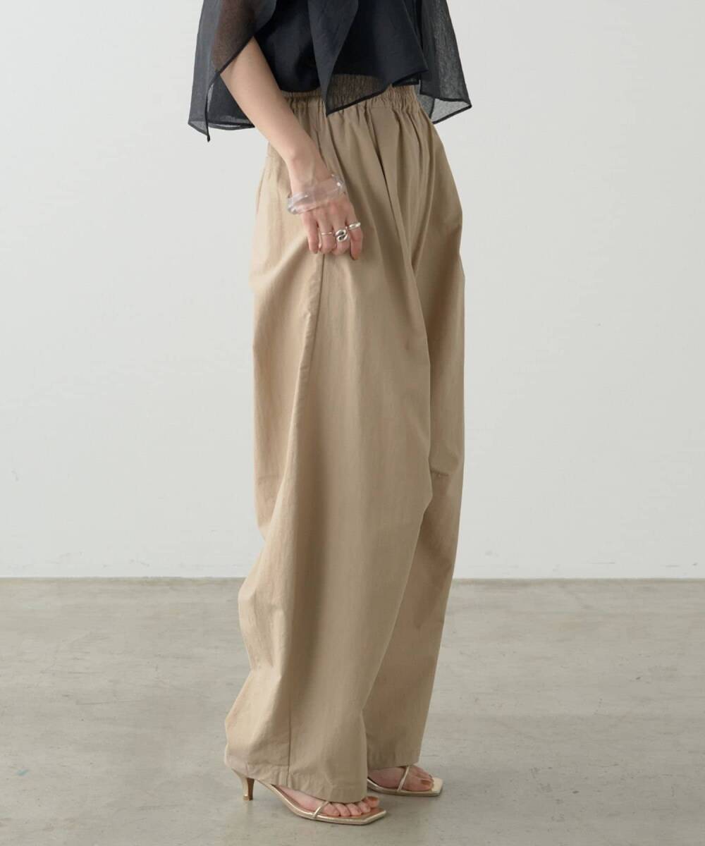 特徴的なシルエットで華奢見えしてくれる大人カジュアルなパンツ・ヒップから膝にかけてのカーブが特徴的で、ボリューム感があるので華奢見えしてくれるパンツです。・ウエストはゴム仕様と紐でも絞れるのでストレスフリーで着心地抜群です。・シンプルながら洗練されたデザインで、程よく抜け感のある大人のパンツスタイルを演出してくれます。・透け感:オフホワイトのみややあり ・裏地:なし ・伸縮性:なし・生地の厚さ:普通 ・光沢:なし・ポケット:あり<洗濯方法>手洗い洗濯可能<着用時期>通年