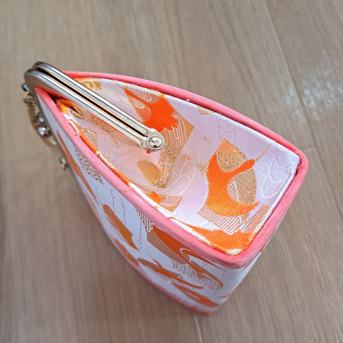 オレンジと白の扇面鶴模様の和装用バッグ、チェーンストラップ付き。