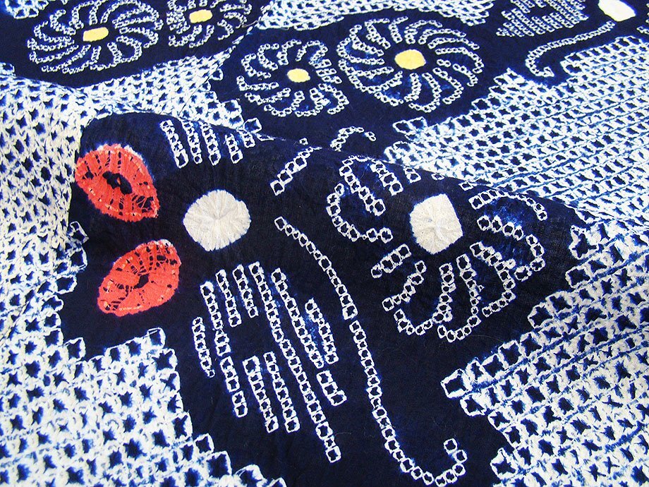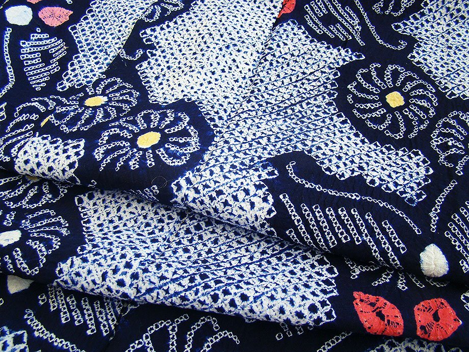 濃紺色地に白、エンジ、黄色等の傘絞りに鹿の子絞りに蝶に花柄の