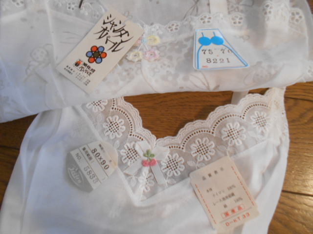 Product name: 昭和レトロ♪キュートなすかし模様(シャンタンオパール)&コットンレースデザイン♪白地スリップ未使用品 2枚セット♪♪