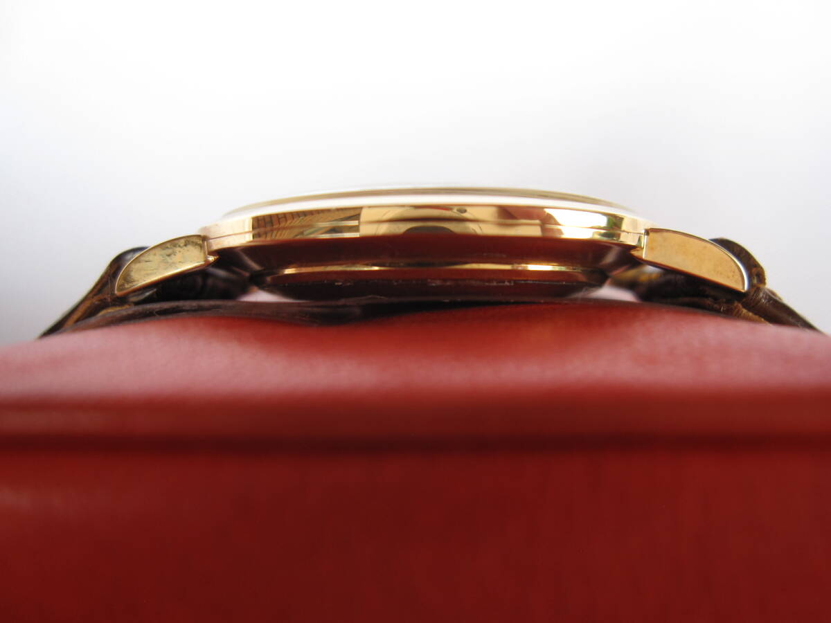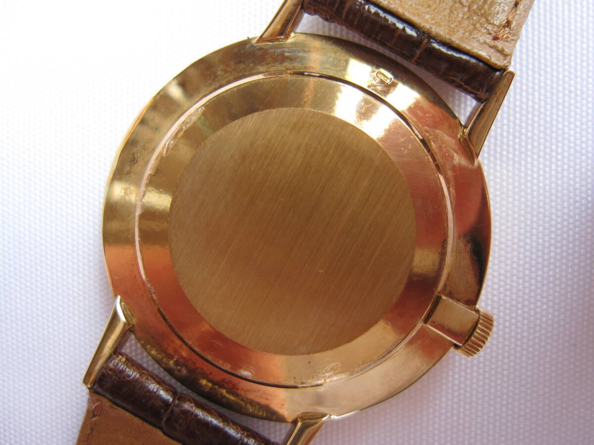 一部に18Kに特有な変色は認めましたが。本体裏側辺縁の裏蓋ではない6時方向に凹があり、そこが18Kの刻印かとも思いましたが、撮った写真を拡大しても良く判らずでした。 尾錠も純正で18Kと思われ、こちらは画像の様に0.750の刻印を確認出来ました。