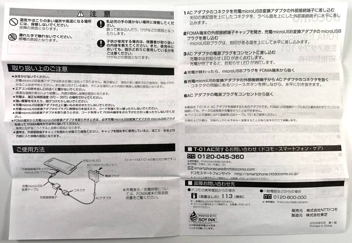 NTTドコモ FOMA充電マイクロUSB変換アダプタ T01(docomo/microUSB/TOSHIBA/T-01A/箱・取扱説明書付/JUNK)