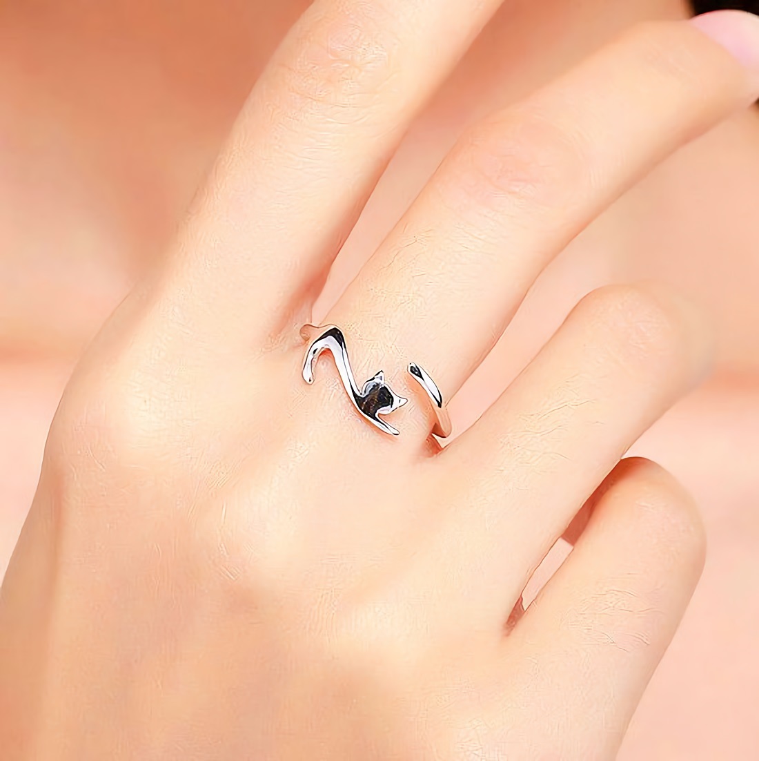 新品1円~★送料無料★ネコ伸び~シルエット フリーサイズ 猫プラチナ仕上925シルバーリング 誕生日プレゼント旅行連休夏海祭ギフト国内発送