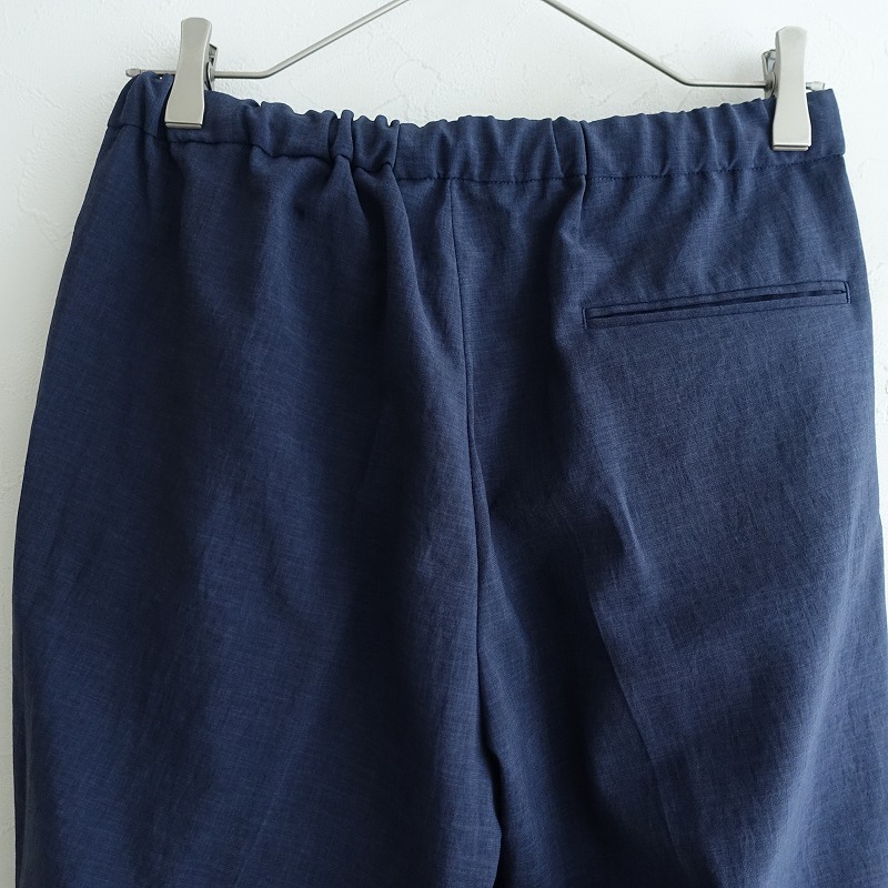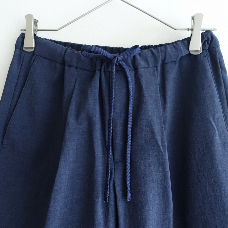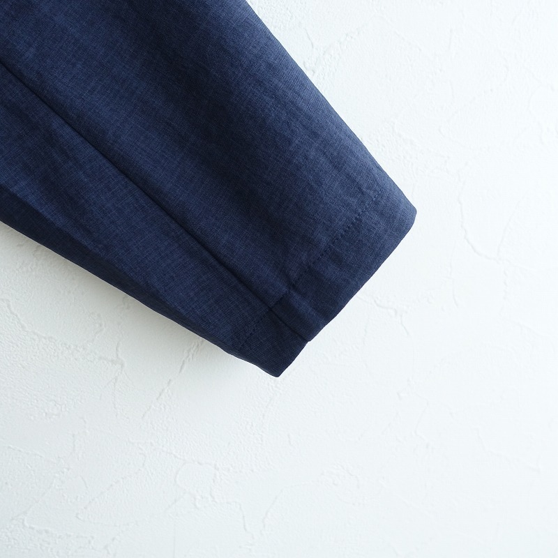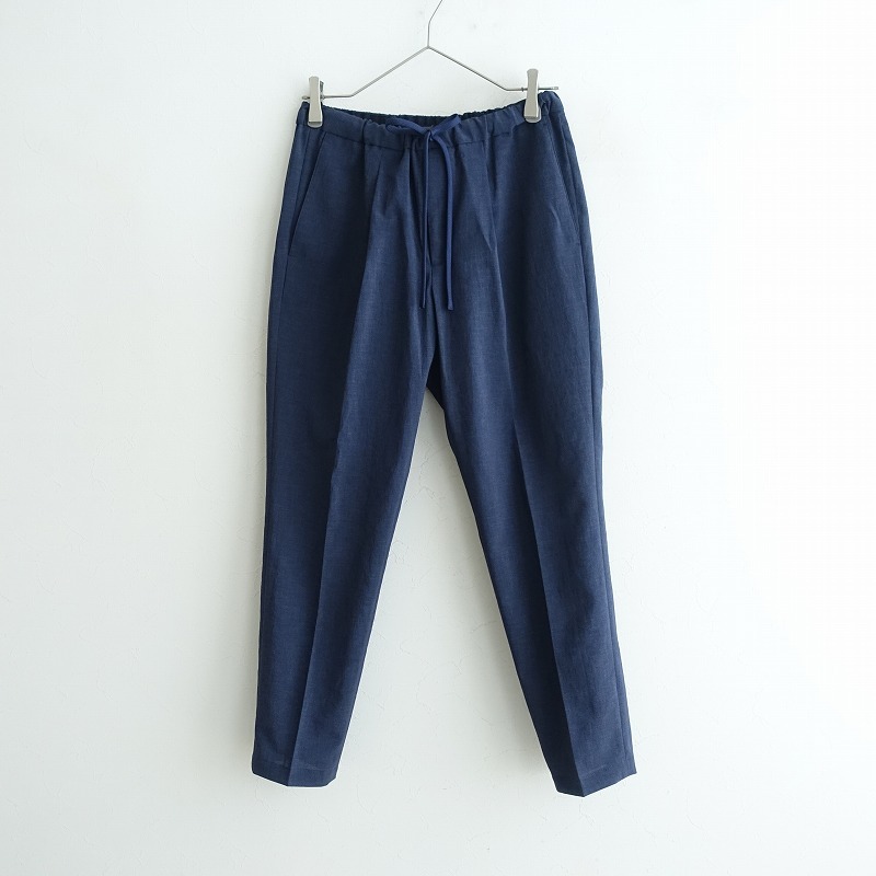 adam et Ropeのセットアップ ノーカラージャケット&イージーパンツです。カラーはくすみネイビーで、薄手の素材です。ジャケットはフロントオープンデザインで、左右にシームポケットがあり、背上部のみ裏地付きです。パンツは前腰にタック入りのテーパードデザインで、ウエスト総ゴム&紐入り、開口部はジッパー開きで、前腰左右&右ヒップにポケットがございます。共布の収納袋が付属しており、定価(メーカー希望小売価格)18,480円の商品です。