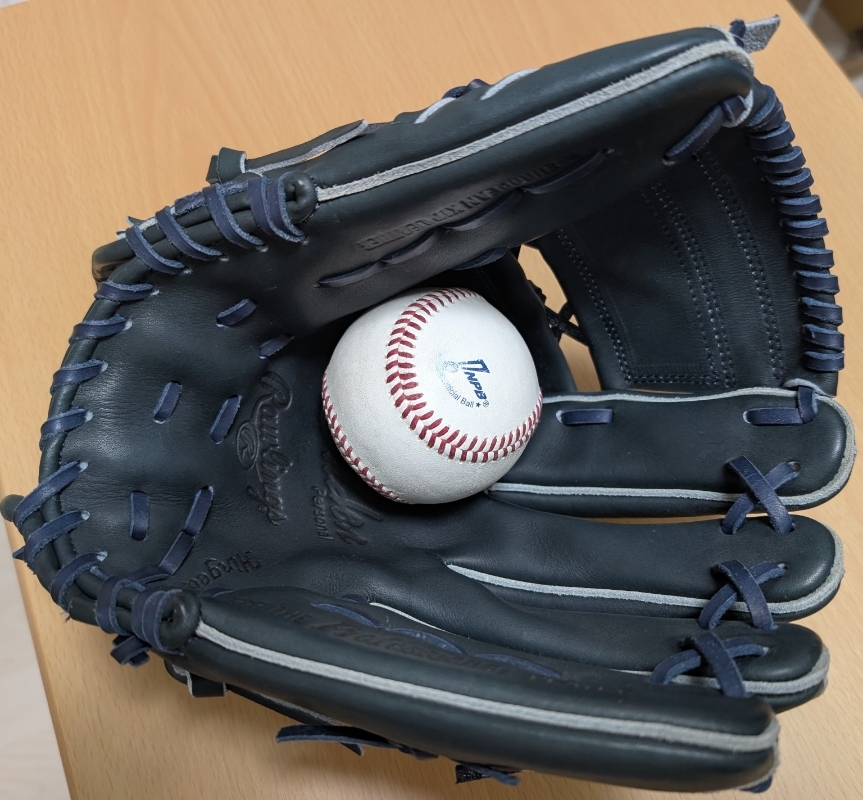 ・グラブの大きさのイメージがわくようボールをポケットに挟んでいますが、ボールは