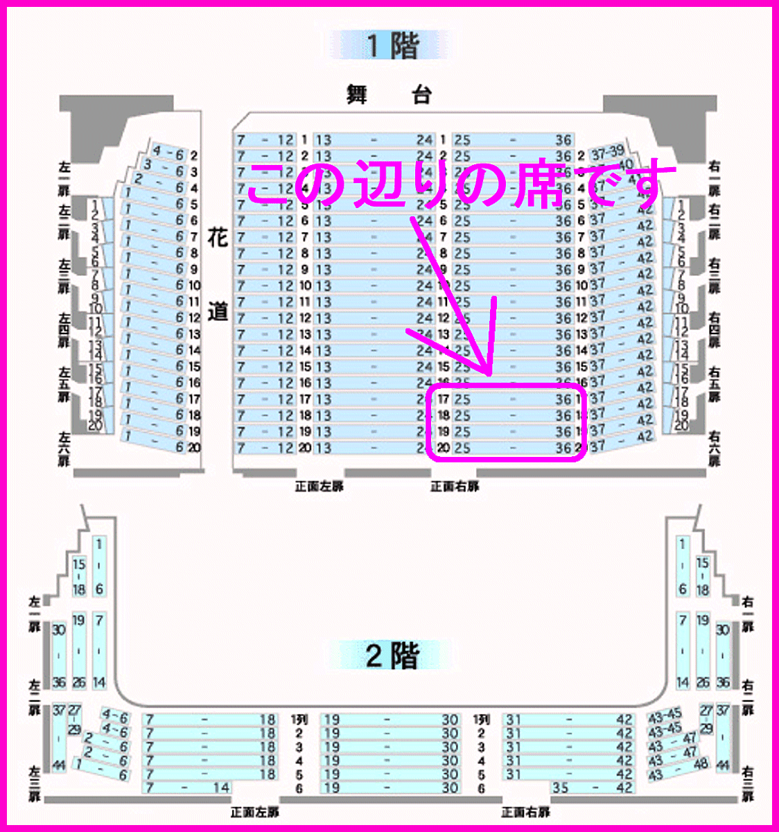 ・座席は掲載画像2枚目でピンクで囲ってある辺りとなります。舞台や花道がよく見える良席ですのでゆっくりと楽しめます。お勧めです。