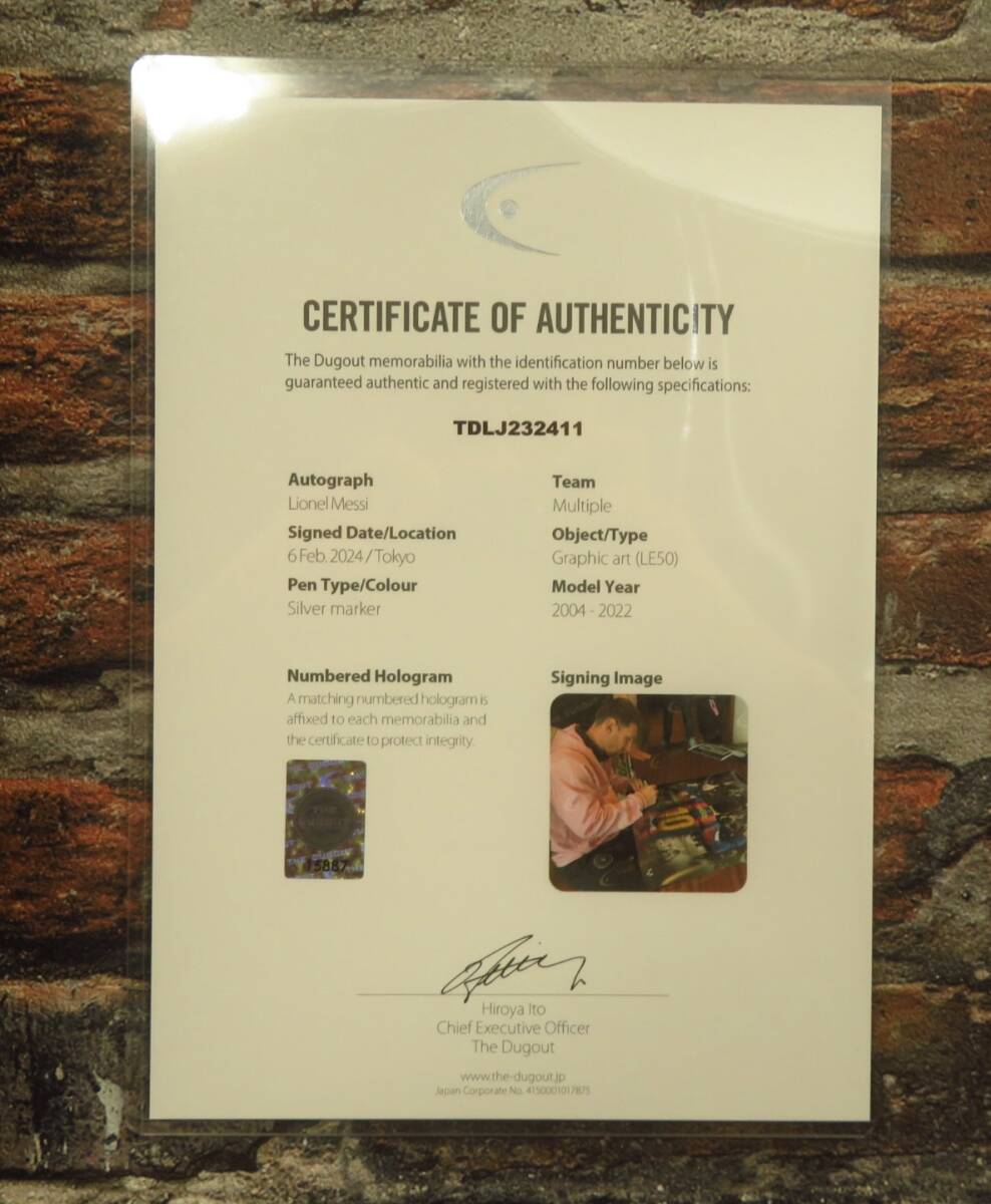 ・2024年2月に東京で執筆された世界50枚限定のグラフィックアート。両手の人差し指で天を指す、亡き祖母に捧げるト レードマークのセレブレーションを披露するメッシ選手の背景に、厳選されたキャリアのハイライトシーンをコラージュ。 バルセロナから始まった挑戦の歴史が走馬灯の如くよみがえるノスタルジックな仕上がりとなっています。サッカー史のみ ならず、スポーツ界においても偉大な功績を残してきたメッシ選手の偉大な歩みを振り返ることのできる唯一無二の作品で す。額装はご注文受付後の開始となるため、約5週間の納期が掛ります。なお、額縁の外寸サイズは作業開始後、若干変更 となる場合がございます。本人による直筆のため、サインの位置、形、大きさに個体差があります。